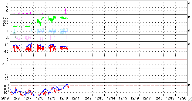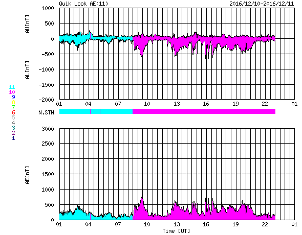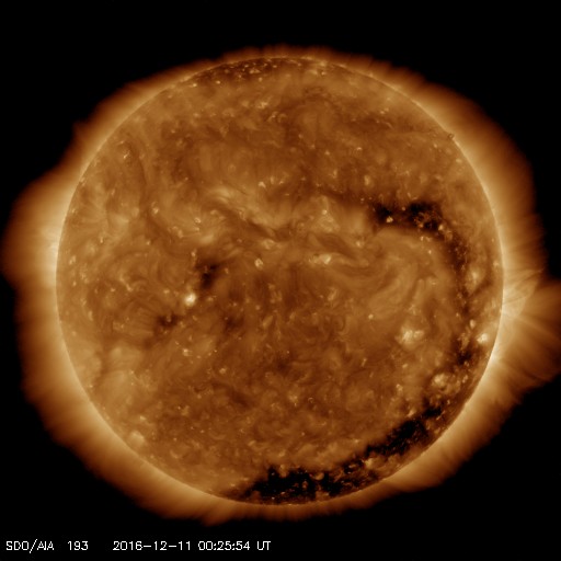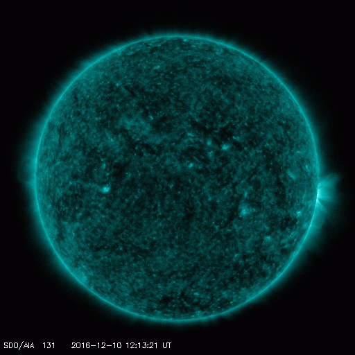 2016/12/11 09:36 更新 C4.0の小規模フレアが発生しました。高速太陽風は600km/秒台を保っています。 担当 篠原 太陽の西の端に没した2615黒点群で、 深夜、11日2時(世界時10日17時)に、 C4.0の小規模フレアが発生しました。 SDO衛星AIA131による動画を掲載します。 動画を見ると、フレアは太陽の端の向こう側で発生しています。 このため、実際のフレアの規模は、 これよりも大きかった可能性があります。 地球側の太陽面には、黒点は見られず、 穏やかな状態です。 太陽風は、680km/秒から640km/秒へ少し速度が下がっていますが、 依然、高い速度の風が続いています。 磁場強度は、5nTから4nTに少し下がっているようです。 磁気圏は活動的な状態が続いていて、 AE指数は500nT前後の中規模の変化が、頻繁に発生しています。 27日周期の図を見ると、 前周期の高速風は、11月15日から本格的な低下が始まっています。 今回も、明日くらいから速度の低下が始まるでしょうか。 放射線帯の高エネルギー電子が増加して、 10,000に達する変化をしています。