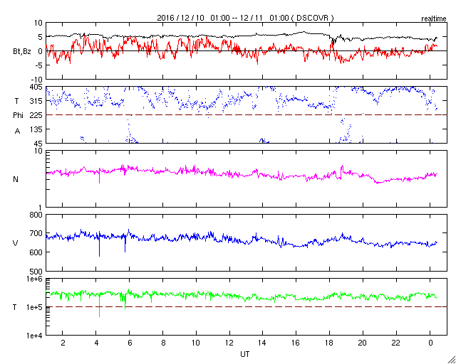 (c) SDO(NASA)、(動画加工 : 宇宙天気ニュース) ![]() SDO衛星のAIA193カメラによる太陽コロナの様子 (c) SDO (NASA) ![]() SDO衛星による太陽の可視光写真 (c) SDO (NASA) ![]() GOES衛星の太陽X線データ (c) NOAA/SWPC ![]() DSCOVRが観測した太陽風の磁場(1番上の枠、黒線は全体の強度、赤線は南北成分) および、太陽風の密度(3番目の紫線)、速度(4番目の青線) (c) データ:NOAA/SWPC、作図:宇宙天気ニュース ![]() リアルタイムAE指数 下段のAEグラフの値が高くなると、オーロラ活動が活発化しています。 (c) 京都大学, NICT ![]() 27日の太陽周期に合わせたデータプロット 太陽が同じ面を地球に向けていた27日前の変化から、今後を予想することができます。 (c) 作図:宇宙天気ニュース