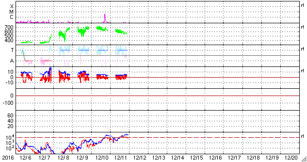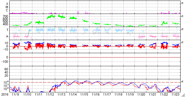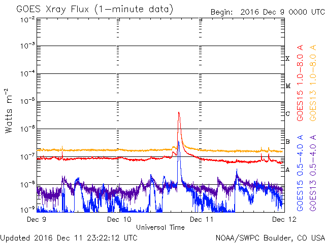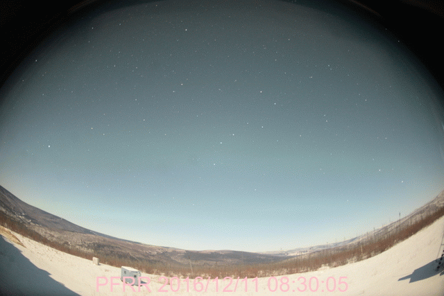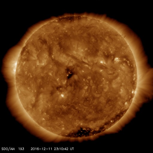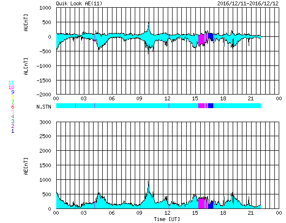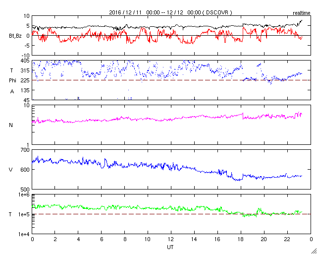 2016/12/12 08:22 更新 高速の太陽風は続いていますが、速度は下がり始めました。 担当 篠原 太陽風の速度は、低下が始まっています。 今日に入った頃に600km/秒台を割り、 現在は、560km/秒です。 高速の状態は続いていますが、 引き続きゆっくりと下がって行きそうです。 27日周期の図を見ると、前周期と同様の推移をしています。 今日いっぱいくらいで500km/秒台も割りそうです。 太陽風の磁場強度は、 4〜5nTと平均的な値で安定しています。 南北成分は、振れ幅は小さいですが、 南北によく変化しています。 このため、磁気圏の活動度もある程度高まった状態が続いていて、 500nT程度の中規模の変化が何度も発生しています。 このうち、世界時11日10時に、 AE指数が瞬間的に800nTに高まった頃のオーロラの様子を、 アラスカ・フェアバンクスのオーロラカメラの動画で紹介します。 オーロラの強い輝きが、一気にやって来て通り過ぎていく印象です。 今日に入って、太陽風の速度が下がり始めたので、 今後はAE指数の変化も小さくなっていくでしょう。 太陽は、北西(右上)に小さい黒点が発生しています。 X線のグラフに目立った変化はなく、太陽は穏やかです。 放射線帯の高エネルギー電子は、 10,000を超えて更に高まっています。 太陽風が落ち着いてきたので、 こちらの変化も落ち着きそうです。