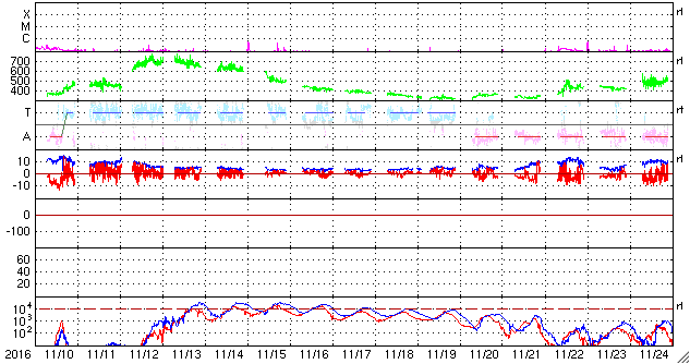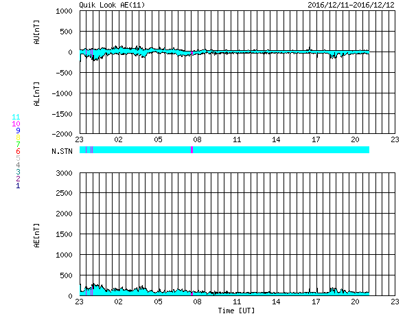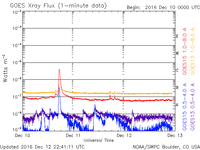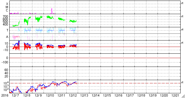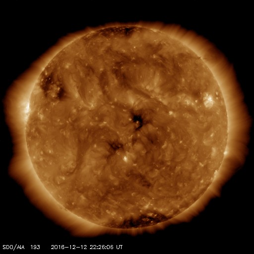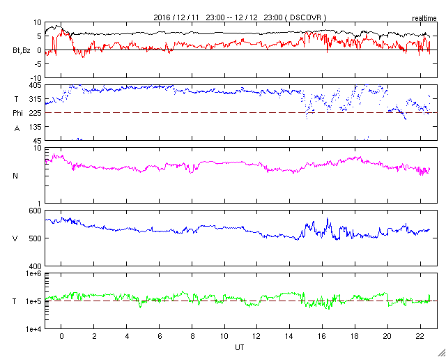 2016/12/13 07:41 更新 太陽風は高速ですが、520km/秒まで速度が下がりました。 担当 篠原 太陽風は高速の風が続いていますが、 速度は低下が続いて、520km/秒まで下がりました。 27日周期の図の前周期と同様の推移になっています。 このまま下がって、 今日のうちに平均的な速度に戻りそうです。 磁場強度は、5nTと平均的な値で推移しています。 南北成分は、北寄りに傾向が変わっています。 このため、磁気圏の活動は弱くなり、 AE指数のグラフは、目立った変化はなくなっています。 SDO衛星AIA193の太陽写真は、 小さいコロナホールが所々に見えるだけです。 この後、太陽風は穏やかな状態がしばらく続くでしょう。 太陽は、北西(右上)の黒点に、 2617黒点群と番号が付いています。 X線グラフに変化はなく、太陽は穏やかです。 放射線帯の高エネルギー電子は、 10,000を超えた状態が続いています。 増加は止まっていて、今後は低下に向かうでしょう。