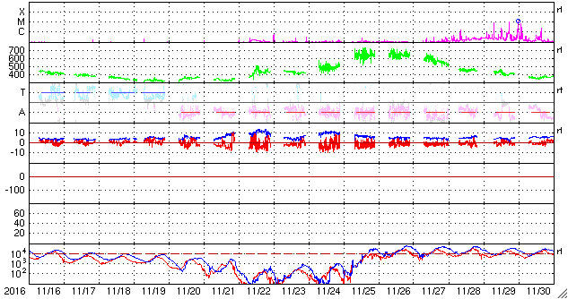 (c) SDO (NASA) ![]() SDO衛星による太陽の可視光写真 (c) SDO (NASA) ![]() DSCOVRが観測した太陽風の磁場(1番上の枠、黒線は全体の強度、赤線は南北成分) および、太陽風の密度(3番目の紫線)、速度(4番目の青線) (c) データ:NOAA/SWPC、作図:宇宙天気ニュース ![]() リアルタイムAE指数 下段のAEグラフの値が高くなると、オーロラ活動が活発化しています。 (c) 京都大学, NICT ![]() 27日の太陽周期に合わせたデータプロット 太陽が同じ面を地球に向けていた27日前の変化から、今後を予想することができます。 (c) 作図:宇宙天気ニュース