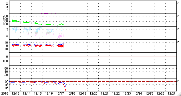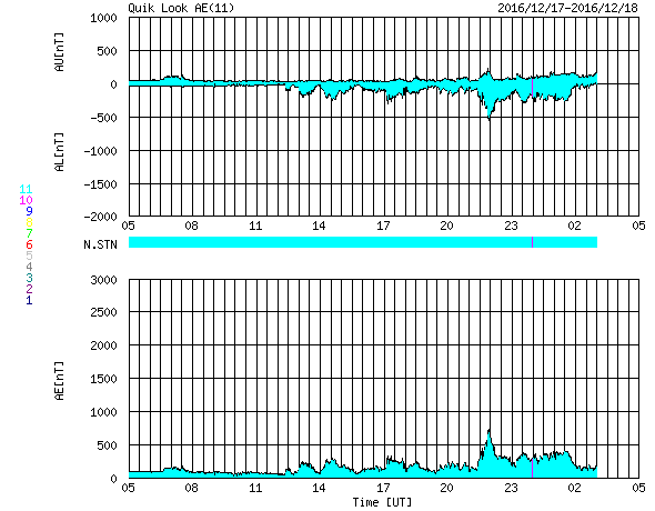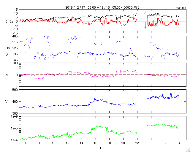 2016/12/18 13:07 更新 太陽風が少し強まって、磁気圏の活動も少し高まっています。 担当 篠原 昨夜から今朝にかけて、太陽風の磁場強度が、 3nTくらいから10nTに強まる変化が発生しました。 その後少し下がって、現在は6nTです。 この変化とともに、速度もゆっくりと上がって、 350km/秒の低速風から、 現在は450km/秒とやや高速になりかけています。 SDO衛星AIA193の太陽写真では、 北半球の低緯度域のコロナホールは、 太陽の西側へ進んでいます。 この領域の影響が及び始めているのかもしれません。 太陽風はこのまま強まって行くのか、引き続き注目して下さい。 太陽風磁場の南北成分は、 磁場の強まり以降、 南向きにやや大きく振れるようになっています。 このため、磁気圏の活動もやや高まっているようで、 AE指数は、200〜300nTの小規模の変化が 連続するようになっています。 今後の太陽風の高まりによって、 磁気圏の活動も強まる可能性があります。 オーロラのライブカメラで、 きれいなオーロラを観望できるかもしれません。 太陽は、ほぼ無黒点の状態が続いています。 X線のグラフも変化はなく、穏やかな状態が続いています。 放射線帯の高エネルギー電子は、 太陽風の変化の影響で、大きく減少しています。