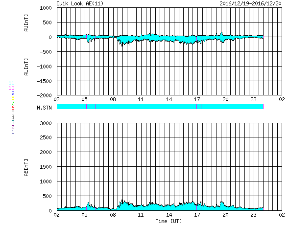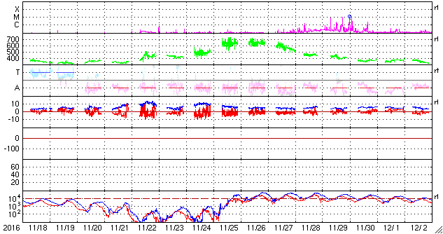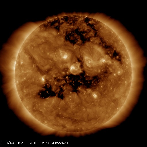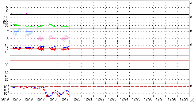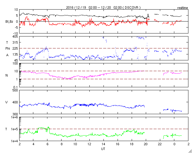 2016/12/20 10:11 更新 太陽風は低速の状態が続いています。 担当 篠原 太陽風の速度は、 昨日のニュース以降も370km/秒とやや低速の状態で推移し、 今朝に入るとさらに低下して、 現在は330km/秒とすっかり低速風になっています。 コロナホールの広がりや、前周期の太陽風との比較から、 高速風の到来が近づいていると予想したのですが、 待たされてしまっています。 太陽風の磁場強度は、5nTと平均的な状態です。 高速太陽風の到来では、 磁場強度の強まりが先に始まることが多いので、 その点では、高速風の始まりはまだ先なのかもしれません。 太陽風磁場の南北成分は、 弱い南寄りの傾向が見られています。 このため、AE指数は250nTと小規模の活動が 連続的に発生しています。 SDO衛星AIA193では、 南半球のコロナホールが東西に大きく広がっています。 この領域の影響が、これからやって来ると思われます。 太陽は、2619黒点群が淡くなって見にくくなる一方、 南西(右下)に新しい黒点が現れているようです。 しかし、目立った活動はなく、太陽は穏やかです。 ![]() SDO衛星のAIA193カメラによる太陽コロナの様子 (c) SDO (NASA) ![]() SDO衛星による太陽の可視光写真。マウスの矢印を写真に重ねると、黒点番号付きの写真に切り替わります。 (c) SDO (NASA) ![]() DSCOVRが観測した太陽風の磁場(1番上の枠、黒線は全体の強度、赤線は南北成分) および、太陽風の密度(3番目の紫線)、速度(4番目の青線) (c) データ:NOAA/SWPC、作図:宇宙天気ニュース ![]() リアルタイムAE指数 下段のAEグラフの値が高くなると、オーロラ活動が活発化しています。 (c) 京都大学, NICT ![]() 27日の太陽周期に合わせたデータプロット 太陽が同じ面を地球に向けていた27日前の変化から、今後を予想することができます。 (c) 作図:宇宙天気ニュース