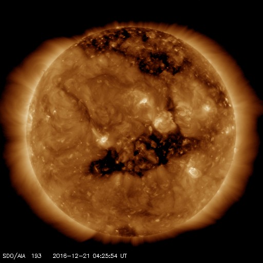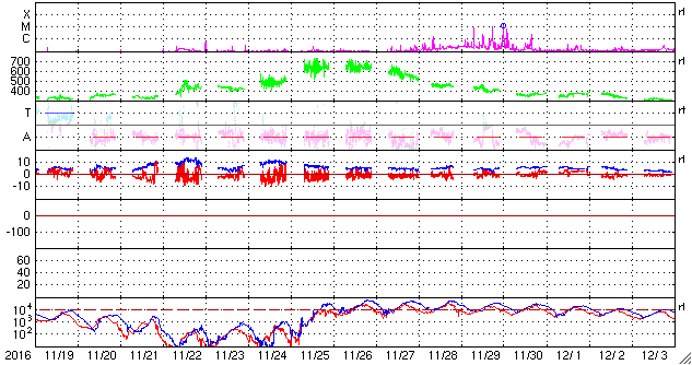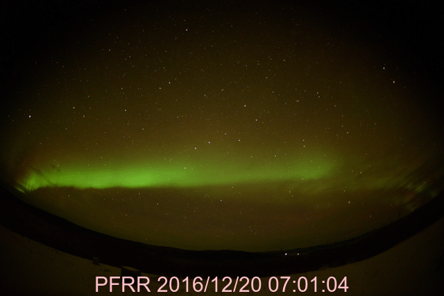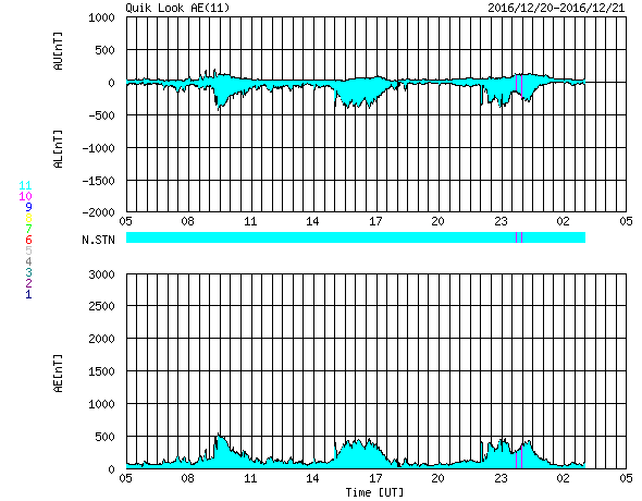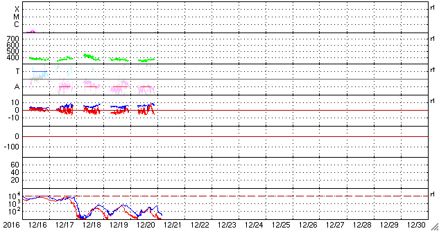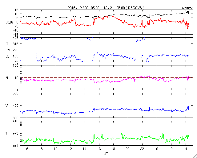 2016/12/21 13:32 更新 太陽風は低速ですが、磁場強度が強まり始めています。 担当 篠原 太陽風は、360km/秒と低速の状態が続いています。 27日周期の図を見ると、 前周期の11月22〜23日に、 速度の小さい高まりが起きていたのですが、 今回は、その変化は完全になくなっています。 一方、太陽風の磁場強度は、 今日に入ったくらいから強まり始めて、 現在は10nTに達しています。 ようやく高速太陽風の到来になりそうです。 太陽風磁場の南北成分は、 南寄りになったり、北寄りになったりしています。 南寄りになった時に磁気圏の活動も高まっていて、 AE指数は、数時間おきに400〜500nTの変化が 繰り返し発生しています。 掲載の図の最初の高まりにあたる、 世界時20日9時頃のオーロラの様子を、 アラスカ・フェアバンクスの動画で紹介します。 27日周期の図を見ると、 前周期の11月24日以降、 太陽風は5日ほど高速の風が続きました。 今回も同様の推移をすると、 これから12月25日頃にかけて、 太陽風の高まりが到来する可能性があります。 今後の太陽風のデータに注目してください。 太陽は、南西(右下)に現れた黒点に、 2620群と番号がつきました。 写真では、昨日よりも大きくなっています。 一方、2619黒点群は見えなくなっています。