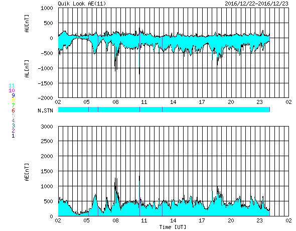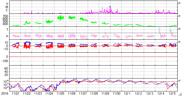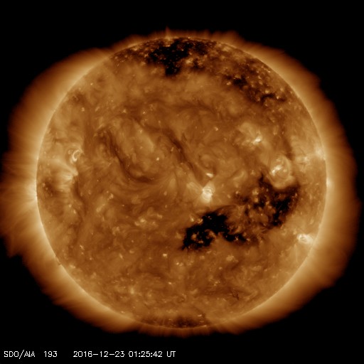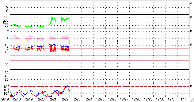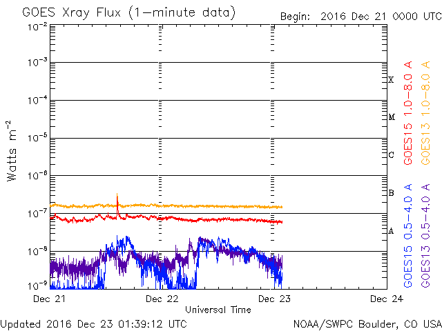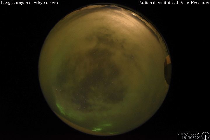 2016/12/23 10:39 更新 太陽風は700km/秒に速度が上がっています。磁気圏の活動も続いています。 担当 篠原 太陽風の速度は、 650km/秒から700km/秒へ更に高まっています。 磁場強度は、7nTから5nTに少し下がって、 平均的な強さに戻っています。 磁場の南北成分は、振れ幅はあまり大きくありませんが、 南寄りに変化しています。 速度がかなり高まっていることもあって、 磁気圏の活動は活発に続いています。 AE指数のグラフは、 500nT前後の中規模の変化が連続しています。 世界時22日19〜20時頃のオーロラの様子を、 ノルウェー・スバールバル島の全天カメラで紹介します。 オーロラの激しい動きが空全体に広がっています。 高速太陽風は、ピークに達しているのではないでしょうか。 SDO衛星AIA193の太陽写真では、 南半球のコロナホールは、全体が中央線を越えたところです。 影響は、もう4日くらい続きそうです。 太陽は、2620黒点群が西の端に近づき、 中央部に発生した黒点はほぼ見えなくなっています。 X線グラフも変化はなく、太陽は穏やかです。 放射線帯の高エネルギー電子は、 GOES15(青線)が10,000を超え、 GOES13(赤線)ももう少しまで上昇しています。 明日は更に高まりそうです。