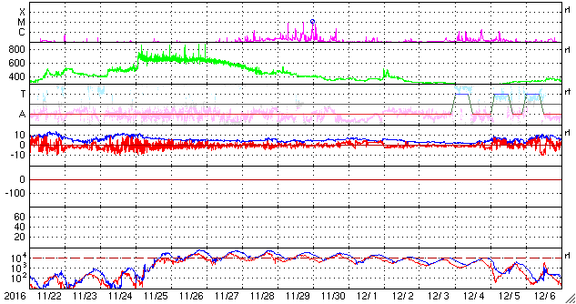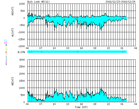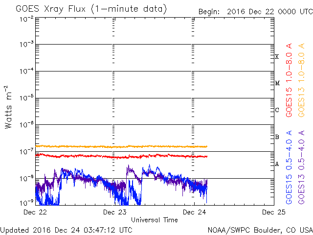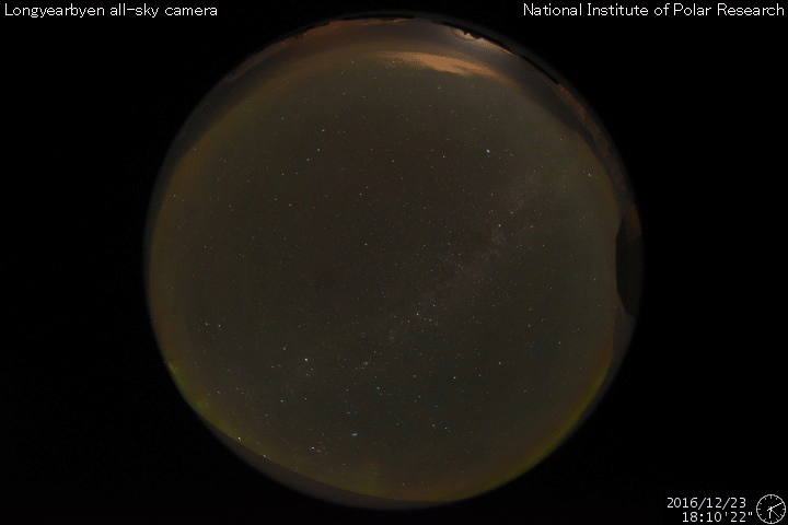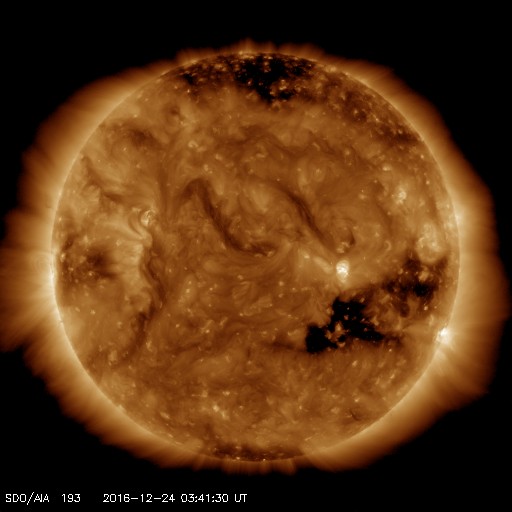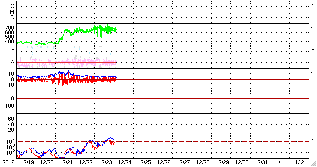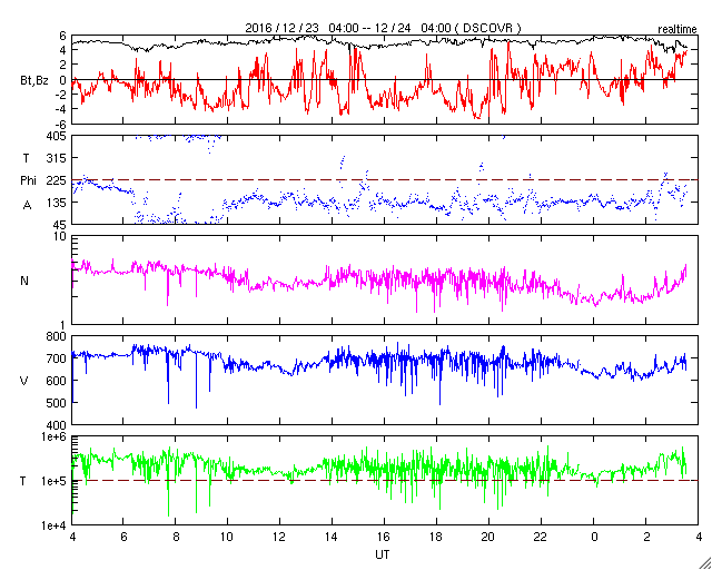 2016/12/24 12:48 更新 700km/秒の高速太陽風が続いてます。太陽は無黒点になっています。 担当 篠原 太陽風の速度は、かなり高まった状態が続いています。 昨日のニュース以降も700km/秒前後の速度を保ち、 今朝、650km/秒近くに一旦下がりましたが、 昼にかけて、再び700km/秒に上がっています。 太陽風の磁場強度は、5nTと平均的な値が続いています。 南北成分は、南寄りに変化しています。 このため、磁気圏の活動も高まった状態が続いていて、 AE指数は、500〜1000nTと中規模の変化が 連続的に発生しています。 世界時23日19時頃のオーロラの様子を、 ノルウェー・スバールバル島の全天カメラで紹介します。 23日のデータでは、AE指数のグラフそのままに、 この様なオーロラの活動が繰り返し観測されています。 27日周期の図を見ると、 前周期の高速風は、11月27日から速度が下がり始めています。 今回はどのようになるでしょうか。 太陽は、黒点が見えなくなっています。 X線のグラフも変化はなく、とても穏やかです。 放射線帯の高エネルギー電子は、更に上昇して、 GOES15(青線)、GOES13(赤線)ともに10,000を超えています。 更に増加するでしょうか。 ![]() ノルウェー・スバールバル島Longyearbyenの全天カメラにより撮影された、世界時23日19時頃のオーロラ。 (c) 国立極地研究所、(動画加工 : 宇宙天気ニュース) ![]() SDO衛星のAIA193カメラによる太陽コロナの様子 (c) SDO (NASA) ![]() SDO衛星による太陽の可視光写真 (c) SDO (NASA) ![]() DSCOVRが観測した太陽風の磁場(1番上の枠、黒線は全体の強度、赤線は南北成分) および、太陽風の密度(3番目の紫線)、速度(4番目の青線) (c) データ:NOAA/SWPC、作図:宇宙天気ニュース ![]() リアルタイムAE指数 下段のAEグラフの値が高くなると、オーロラ活動が活発化しています。 (c) 京都大学, NICT ![]() 27日の太陽周期に合わせたデータプロット 太陽が同じ面を地球に向けていた27日前の変化から、今後を予想することができます。 (c) 作図:宇宙天気ニュース