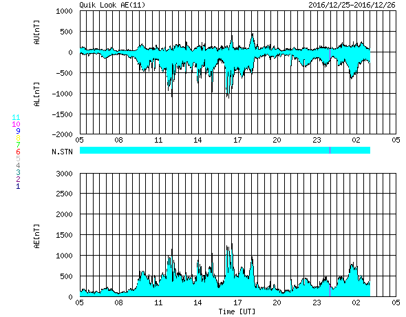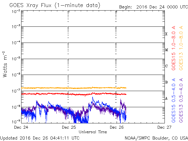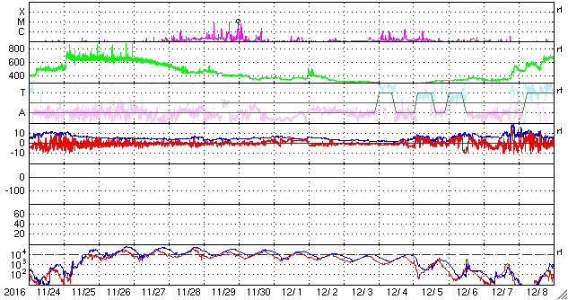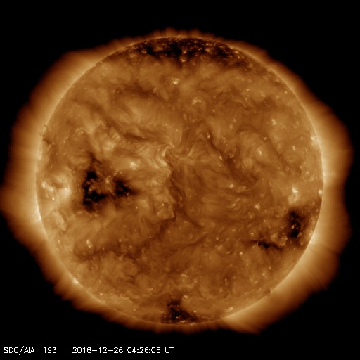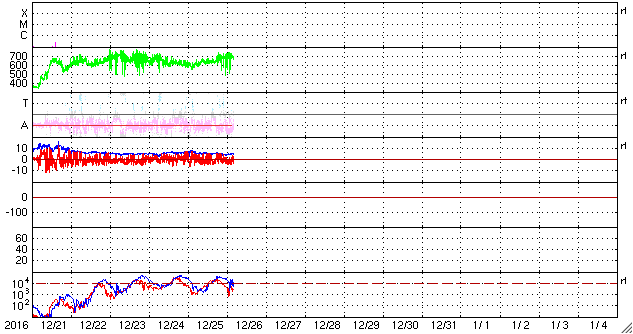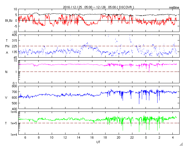 2016/12/26 13:41 更新 太陽風の速度は再び700km/秒に高まっています。 担当 篠原 太陽風の速度は、今日にかけて再び上昇して、 今朝くらいから、700km/秒付近で推移しています。 27日前の変化やコロナホールの様子から、 速度は低下に向かいそうだったのですが、 かなり高まった状態を維持しています。 太陽風の磁場強度は、 5nTと平均的な値が続いています。 南北成分は、北を向いたり、南を向いたり、 時間をおいて変化しているようですが、 -5nT近くまで南向きに変化していることもあり、 磁気圏の活動は昨日の図よりも高まっていて、 AE指数は、500nTを超える時間帯が続き、 時々、1000nTに達する変化も発生しています。 SDO衛星AIA193の太陽写真では、 コロナホールは西側の端近くまで進み、 太陽風の影響はこれから弱まっていくと思われます。 太陽は、黒点は見えず、 X線グラフもほとんど変化がなく、とても穏やかです。 放射線帯の高エネルギー電子は、 昨日と同じ程度に高まった状態が続いています。