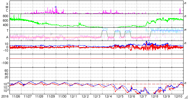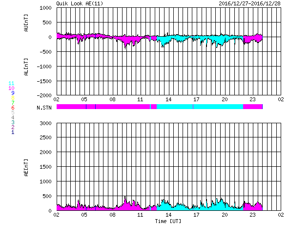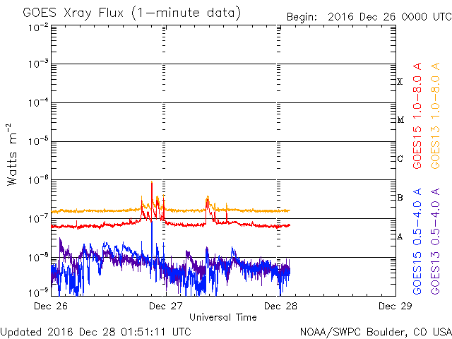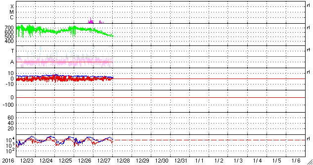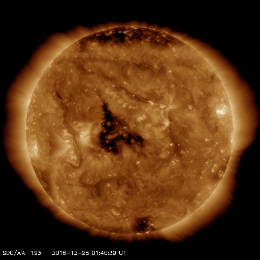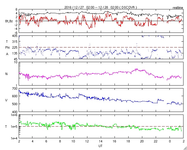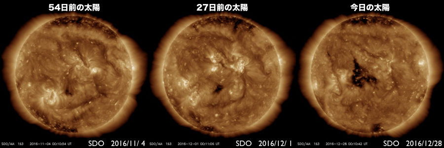 2016/12/28 10:51 更新 太陽風の速度は500km/秒に下がり、高速風は終わりに近付いています。 担当 篠原 太陽風速度の低下は続き、昨日は600km/秒台だった太陽風は、 現在はちょうど500km/秒まで下がっています。 値としてはまだ高速の状態ですが、 この後もこのまま下がっていきそうです。 太陽風の磁場強度も3nTに下がっていて、 この変化も高速風の終わりに良く見られることです。 磁場の南北成分は、南北両方に変化していますが、 変化の値は小さくなり、磁気圏への影響は弱くなっています。 AE指数のグラフも、変化は連続していますが、 300nT程度の小さいものばかりになっています。 高速太陽風の終わりとともに、 磁気圏も穏やかになっていくでしょう。 SDO衛星AIA193の太陽写真を見ると、 太陽の中央部にコロナホールがあります。 1周期前(27日前)はまだ小さかったコロナホールが(1枚目の図)、 この1回転の間に広がったようです。 このため、3〜4日後の12月31日、1月1日あたりに、 太陽風の高まりがやって来るかもしれません。 この変化は前周期の太陽風には見られなかったもので、 今回どのように推移するか注目して下さい。 新年を飾るオーロラの活動になるかもしれません。 太陽は、2621黒点群は早くも小さくなっています。 Bクラスの小さい活動は起きていますが、太陽は穏やかです。 放射線帯の高エネルギー電子は、 GOES15、GOES13ともに10,000を超えています。 しかし、値としては下がり始めています。