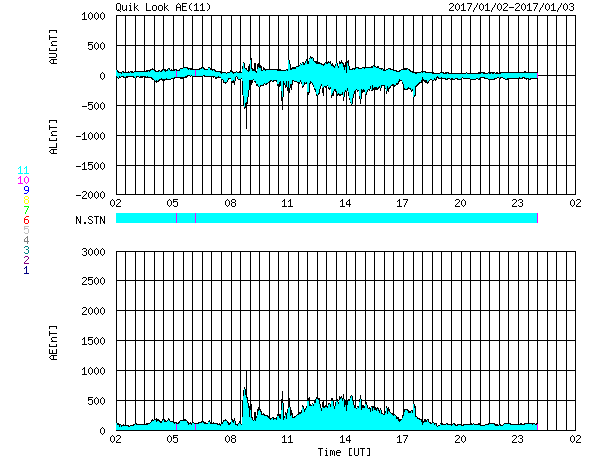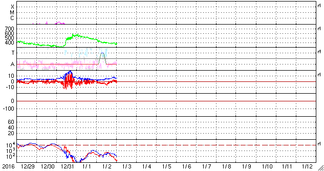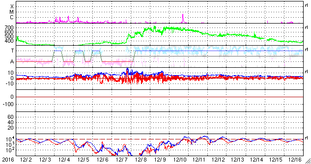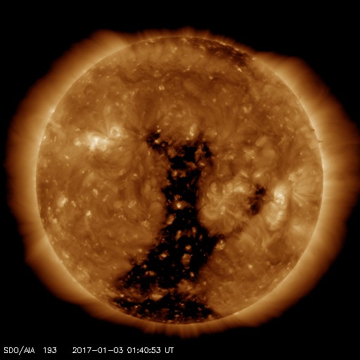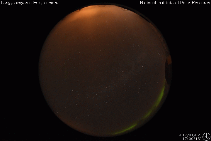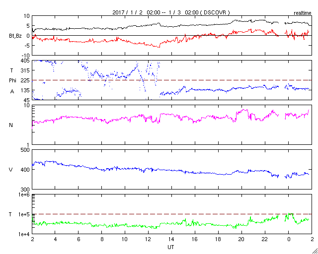 2017/ 1/ 3 10:55 更新 太陽風はやや低速です。高速太陽風の回帰が近付いています。 担当 篠原 太陽風の速度は、更に低下を続け、 現在は370km/秒とやや低速の状態になっています。 磁場強度は、3nTから少し強まって、 現在は6〜7nTです。 太陽風は穏やかに推移しています。 太陽風磁場の南北成分は、 昨日の昼から夜にかけて、弱い南向きに振れ続けています。 このため、磁気圏の活動もやや高まって、 AE指数は、500nTの中規模の活動が 半日ほど続いています。 一番最後の高まりにあたる、 世界時2日18時頃のオーロラの様子を、 ノルウェー・スバールバル島の動画で紹介します。 3日連続の掲載ですが、それぞれ見え方が違っています。 今日の動画は、一段おとなしい印象です。 SDO衛星AIA193を見ると、 北半球の低緯度から南極に向かって、 幅の広いコロナホールが縦にまっすぐ伸びています。 この領域から噴き出している速度の高い太陽風が、 もうすぐ地球に到来します。 27日周期の図を参照すると、 前周期は12月7日に速度が高まり始めています。 コロナホールの変化で、到来のタイミングは変化しますが、 今後の太陽風の変化に注目して下さい。 速度の変化に先立って、太陽風の磁場が強まり、 南向きに大きく振れると、オーロラの活動も高まります。 各地のライブカメラにも注目して下さい。 太陽は、昨日の小さい黒点はすぐに消え、 今日はまた別の小さい黒点が西寄りに見えています。 X線グラフに変化はなく、静かな状態が続いています。