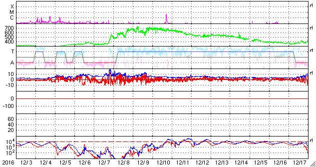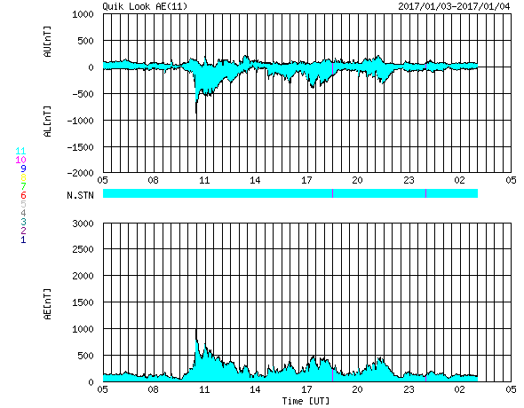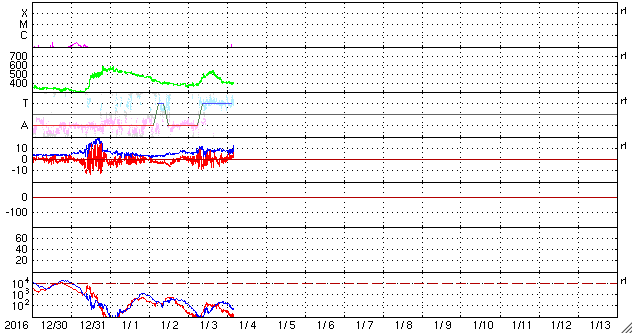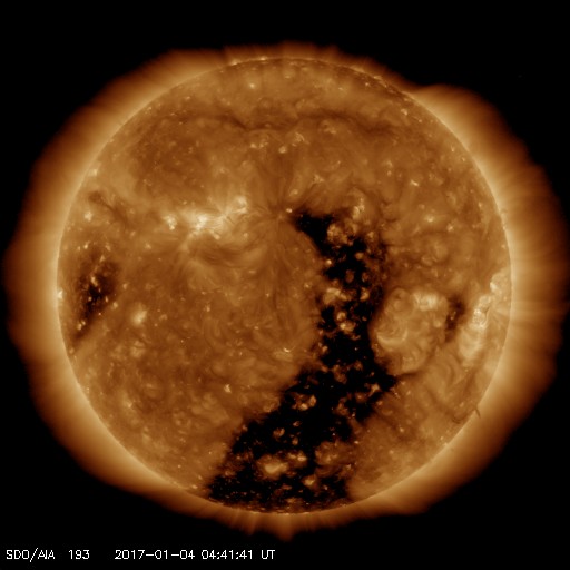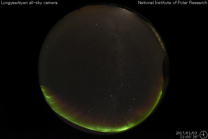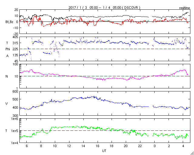 2017/ 1/ 4 13:56 更新 太陽風の速度は一旦上がって、すぐに下がりましたが、再び上昇を始めそうです。 担当 篠原 昨日の夕方から、太陽風の速度は上昇を始め、 3日21時(世界時3日12時)には、500km/秒に達しました。 高速風領域の回帰が始まったと思われたのですが、 今日に入った頃から速度は低下し始めて、 今朝早くには400km/秒と平均的な速度に戻ってしまいました。 昨日(もしくは2、3日前)の記事のSDO衛星AIA193の写真を見ると、 コロナホールの右に向かって細長く伸びている部分があります。 この領域の影響が少し早めにやって来たのかもしれません。 現在の太陽風は、速度は400km/秒ですが、 磁場強度が15nTに強まっています。 これから高速太陽風の本体部分がやって来るようです。 この後の太陽風の変化に注目して下さい。 太陽風の高まりに伴って、 磁気圏の活動もやや活発になっています。 AE指数は、最初に1000nTとやや大きい変化を記録して、 以降、500nT前後の変化が半日ほど続いています。 最後の400nTの高まりにあたる、 世界時3日22時前後のオーロラの様子を、 ノルウェー・スバールバル島の全天カメラの動画で紹介します。 頭上でオーロラの輝きが華やかに続いています。 太陽は、西側に昨日見えていた小さい黒点に、 2624黒点群と番号が付きましたが、 今日の写真ではほとんど見えなくなっています。 ここでBクラスの小さいフレアが発生していますが、 太陽は、全体としてはとても穏やかです。 ![]() ノルウェー・スバールバル島Longyearbyenの全天カメラにより撮影された、世界時3日21〜23時のオーロラ。 (c) 国立極地研究所、(動画加工 : 宇宙天気ニュース) ![]() SDO衛星のAIA193カメラによる太陽コロナの様子 (c) SDO (NASA) ![]() SDO衛星による太陽の可視光写真。マウスの矢印を写真に重ねると、黒点番号付きの写真に切り替わります。 (c) SDO (NASA) ![]() DSCOVRが観測した太陽風の磁場(1番上の枠、黒線は全体の強度、赤線は南北成分) および、太陽風の密度(3番目の紫線)、速度(4番目の青線) (c) データ:NOAA/SWPC、作図:宇宙天気ニュース ![]() リアルタイムAE指数 下段のAEグラフの値が高くなると、オーロラ活動が活発化しています。 (c) 京都大学, NICT ![]() 27日の太陽周期に合わせたデータプロット 太陽が同じ面を地球に向けていた27日前の変化から、今後を予想することができます。 (c) 作図:宇宙天気ニュース