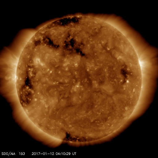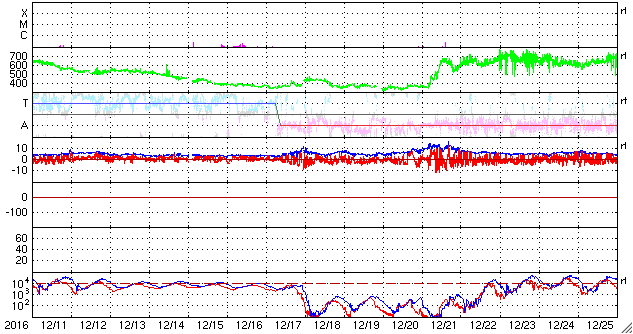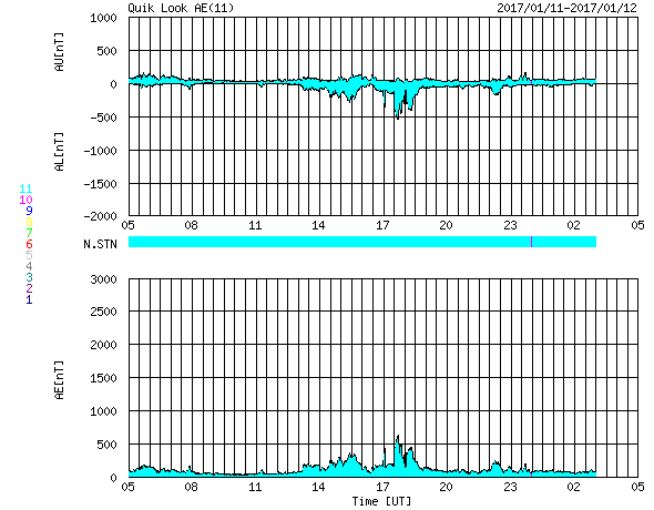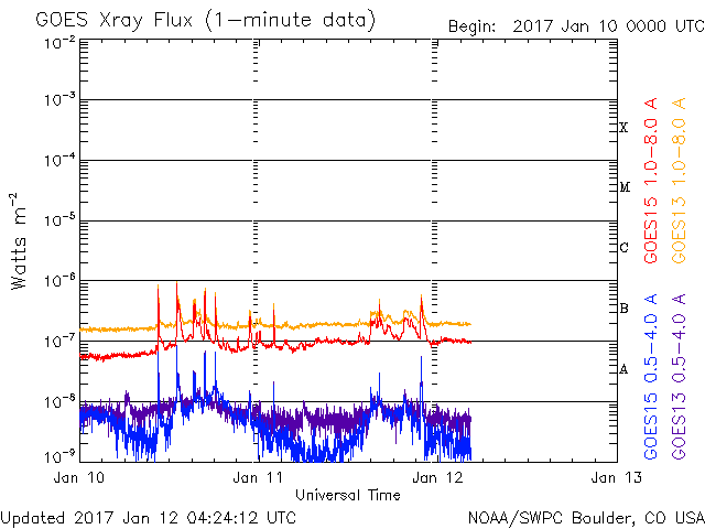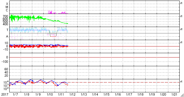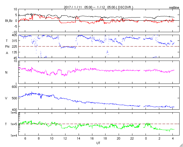 2017/ 1/12 13:24 更新 太陽風は平均的な速度に下がっています。 担当 篠原 太陽風の速度は、 昨夜、11日19時(世界時11日10時)頃まで 500km/秒台を保っていましたが、 その後、低下して行き、 今朝くらいに430km/秒まで下がりました。 1月4日に始まった今回の高速太陽風は、 7日ほど続きました。 太陽風の磁場強度は、 3〜4nTとやや下がった状態で推移しています。 南北成分は、小さい変化に留まっています。 磁気圏も全体としては穏やかで、 AE指数のグラフは、 中央に300〜500nTの小規模の変化が見られる程度です。 太陽は、西の端の領域で、 Bクラスの小さいフレアの発生が続きましたが、 現在は、ちょうど没して見えなくなるあたりで、 今後はX線グラフの変化はなくなりそうです。 無黒点の状態も続いています。 放射線帯の高エネルギー電子は、減少が進み、 GOES15(青線)が、10,000に達する程度です。