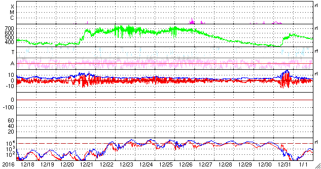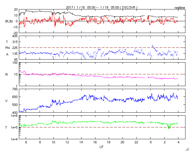 2017/ 1/18 14:42 太陽風の磁場が強まり、高速風の到来が近づいているようです。