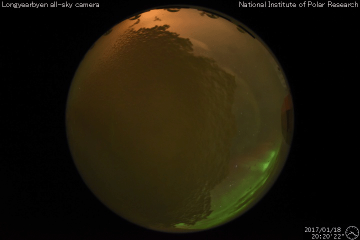 ノルウェー・スバールバル島Longyearbyenの全天カメラにより撮影された、世界時18日20〜22時頃のオーロラ。