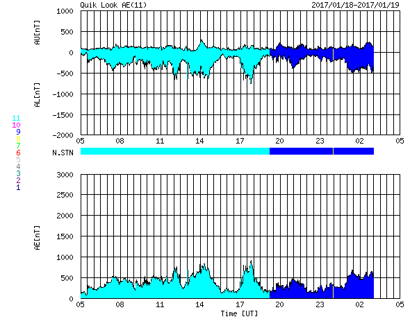 下段のAEグラフの値が高くなると、オーロラ活動が活発化しています。