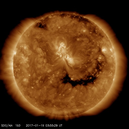 コロナホールの全体が西半球に進んだところです。