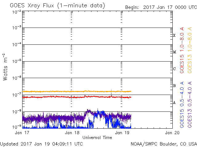 2017/ 1/15 10:25 太陽は穏やかです。太陽風は低速の状態で、磁気圏も静穏です。