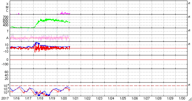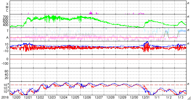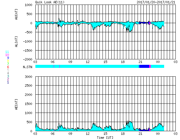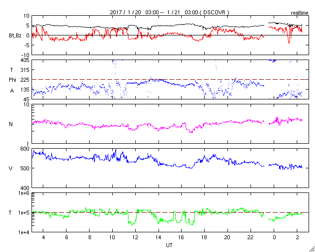 2017/ 1/21 11:32 更新 高速太陽風は500km/秒まで下がっています。太陽で小さいフレアが頻発しています。 担当 篠原 太陽風の速度は、ゆっくりと低下が続いて、 昨日の570km/秒から、現在は500km/秒まで下がっています。 磁場強度は、5nTと平均的な状態が続いています。 27日周期の図を見ると、 前周期の高速太陽風は12月28日まで続いています。 この27日後を考えると、3日後の1月24日に相当します。 今回の高速風はどこまで続くでしょうか。 太陽風磁場の南北成分は、 0nTを挟んで、南北にゆっくりと変化しています。 これに合わせて、磁気圏の活動も数時間おきに高まっている様で、 AE指数のグラフでは、300〜500nTの小規模の高まりが、 間をあけて繰り返し発生しています。 SDO衛星AIA193の太陽写真では、 太陽の東側(左側)にコロナホールが見えています。 次の太陽風の変化は、この領域がもたらすでしょう。 前周期を参考にすると、27〜28日頃になりそうです。 太陽は、東側の新しい黒点に、 2627群、2628群と番号が付けられています。 2つの領域では、Bクラスの小さいフレアが頻繁に発生していて、 X線のグラフに変化が目立っています。 更に規模が高まって、Cクラスに達するでしょうか。 この後の活動の変化に注目して下さい。