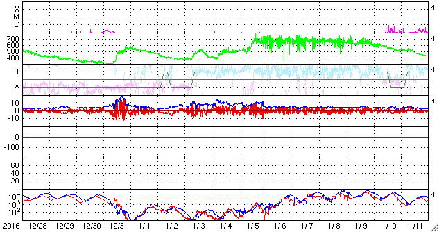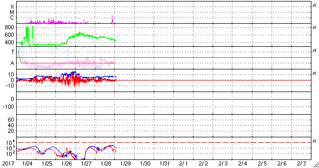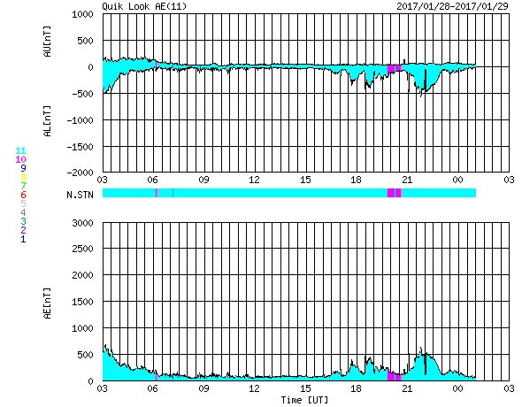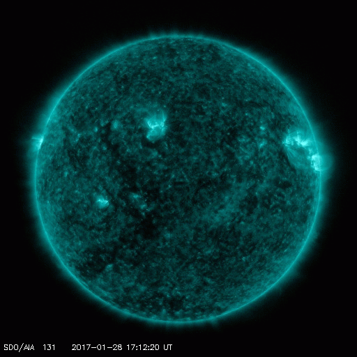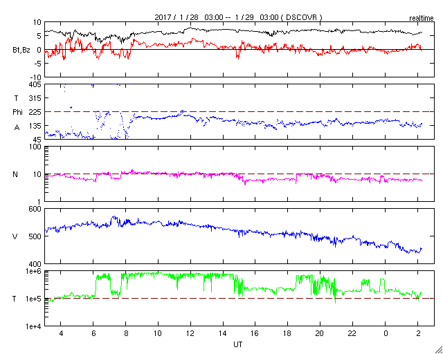 2017/ 1/29 11:22 更新 高速太陽風は終わりつつあります。C2.8の小規模フレアが発生しました。 担当 篠原 太陽風の速度は、 昨日の午後にかけて、再び550km/秒へ高まる変化が見られましたが、 夜以降はゆっくりと低下して、 現在は450km/秒とやや高速の状態になっています。 今回の高速風は、3日ほど続いたところで終わりを迎えそうです。 太陽風の磁場強度は、6nT前後で安定しています。 南北成分は、0nT付近で小さく変化する程度ですが、 オーロラの活動度を示すAE指数のグラフは、 後半に、300〜500nTの小規模の変化も起きています。 太陽風が落ち着いてきたので、 磁気圏の活動も更に静かになっていくでしょう。 SDO衛星AIA193のコロナの写真では、 赤道から南半球へ広がるコロナホールの右端が、 太陽の中心線に達しています。 3日後くらいから、 今度はこの領域の影響で高速の太陽風が始まりそうです。 前周期は、1週間近く速度の高い太陽風が続きました。 オーロラの活動の高まりにも注目してください。 太陽では、西端(右端)の2628黒点群のとなりで、 C2.8の小規模フレアが発生しています。 SDO衛星AIA131による動画を掲載しますが、 この領域は、すぐに太陽の向こう側に回って見えなくなります。 ![]() 太陽の西端(右端)で発生したC2.8の小規模フレア。SDO衛星AIA131。 (c) SDO (NASA)、(動画加工 : 宇宙天気ニュース) ![]() SDO衛星のAIA193カメラによる太陽コロナの様子 (c) SDO (NASA) ![]() SDO衛星による太陽の可視光写真。マウスの矢印を写真に重ねると、黒点番号付きの写真に切り替わります。 (c) SDO (NASA) ![]() DSCOVRが観測した太陽風の磁場(1番上の枠、黒線は全体の強度、赤線は南北成分) および、太陽風の密度(3番目の紫線)、速度(4番目の青線) (c) データ:NOAA/SWPC、作図:宇宙天気ニュース ![]() リアルタイムAE指数 下段のAEグラフの値が高くなると、オーロラ活動が活発化しています。 (c) 京都大学, NICT ![]() 27日の太陽周期に合わせたデータプロット 太陽が同じ面を地球に向けていた27日前の変化から、今後を予想することができます。 (c) 作図:宇宙天気ニュース
