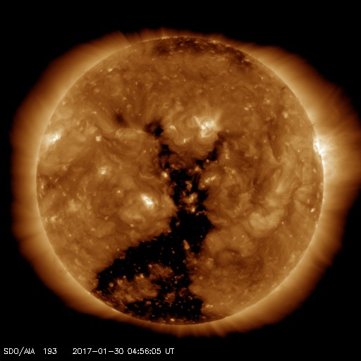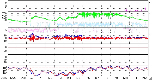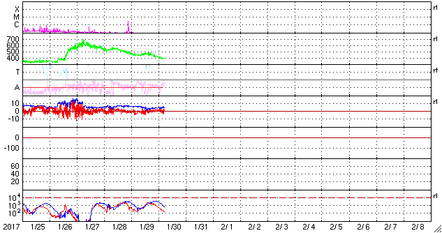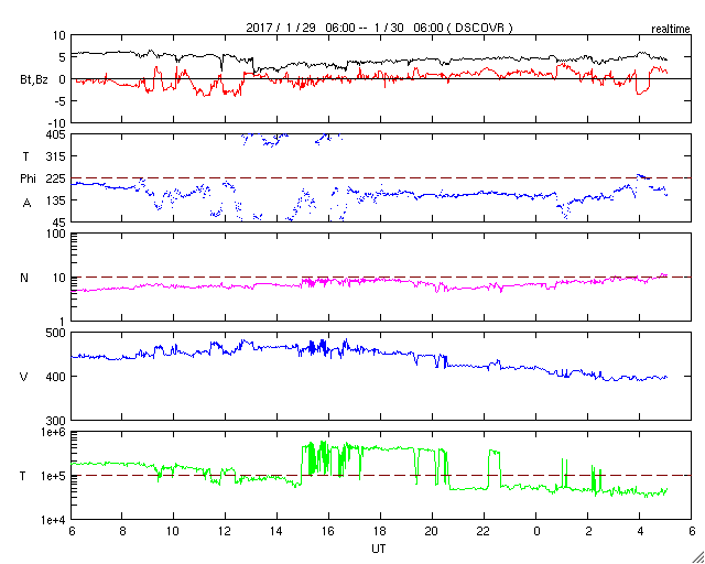 2017/ 1/30 14:12 更新 太陽風は平均的な状態で、磁気圏も穏やかです。 担当 篠原 太陽風の速度は、400km/秒まで下がり、 平均的な状態に戻っています。 磁場強度も、5nTで安定しています。 オーロラの活動度を示すAE指数のグラフは、 前半には300nTの小規模の活動が見られますが、 後半からはすっかり変化がなくなっています。 SDO衛星AIA193では、 赤道域のコロナホールはちょうど太陽の中心にあり、 地球の方向へ速度の高い太陽風を吹き出しているところです。 これから3日程度かけて地球までやって来るので、 2月2日頃は、高速太陽風の真っ最中ではないでしょうか。 太陽は、2628黒点群が西の端に隠れるくらいに進み、 C2.8のフレアを起こした領域は見えなくなっています。 一方、東端に新しい黒点が姿を現しています。 ![]() SDO衛星のAIA193カメラによる太陽コロナの様子 (c) SDO (NASA) ![]() SDO衛星による太陽の可視光写真。マウスの矢印を写真に重ねると、黒点番号付きの写真に切り替わります。 (c) SDO (NASA) ![]() DSCOVRが観測した太陽風の磁場(1番上の枠、黒線は全体の強度、赤線は南北成分) および、太陽風の密度(3番目の紫線)、速度(4番目の青線) (c) データ:NOAA/SWPC、作図:宇宙天気ニュース ![]() リアルタイムAE指数 下段のAEグラフの値が高くなると、オーロラ活動が活発化しています。 (c) 京都大学, NICT ![]() 27日の太陽周期に合わせたデータプロット 太陽が同じ面を地球に向けていた27日前の変化から、今後を予想することができます。 (c) 作図:宇宙天気ニュース