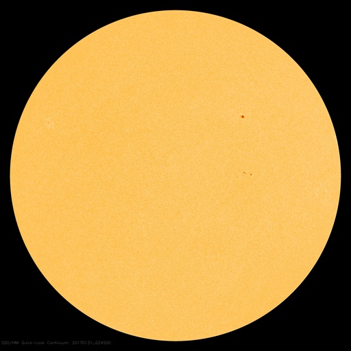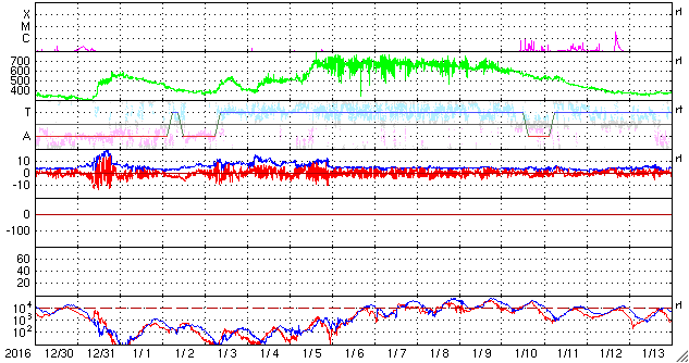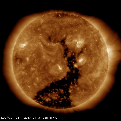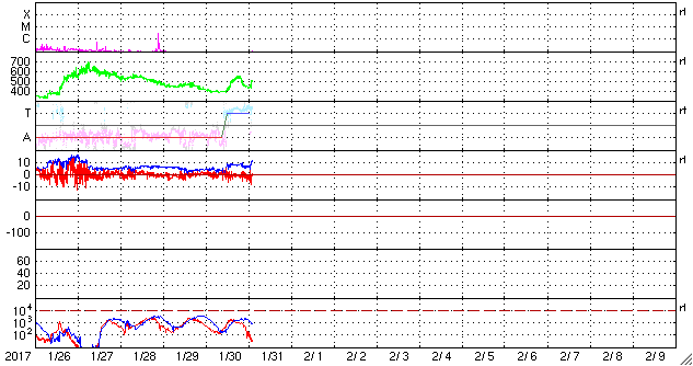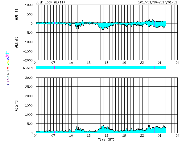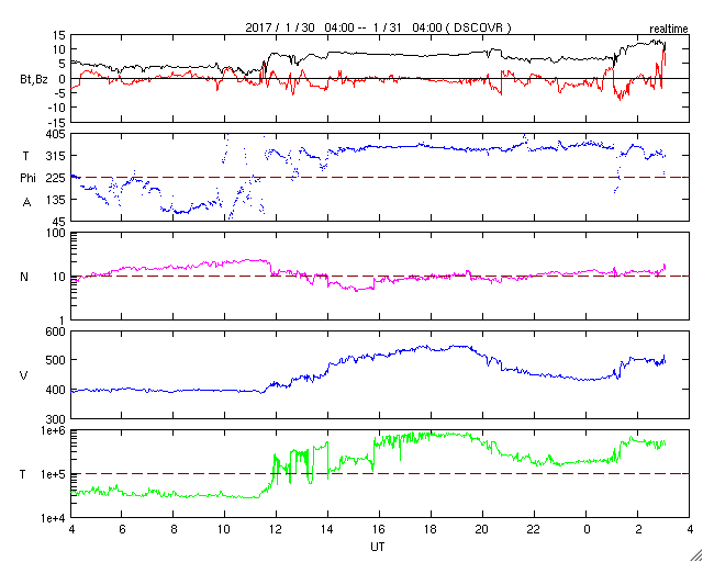 2017/ 1/31 12:16 更新 太陽風の速度が500km/秒に高まっています。 担当 篠原 昨夜、30日21時(世界時30日12時)より、 太陽風の速度が高まり始め、 今日の未明に、550km/秒の高速状態に達しました。 その後、速度は下がって、 今朝には430km/秒と通常の状態に戻ったのですが、 昼前から再び高まって、現在は500km/秒の高速風になっています。 27日周期の図の前周期を見ると、 1月3〜4日にも、太陽風速度の細かい変化が起きていました。 今回、その変化が同様の推移として回帰したようです。 SDO衛星AIA193の太陽写真には、 この高速風に対応する位置に はっきりとしたコロナホールは見られなかったのですが、 27日前と同様の高速風の到来になっています。 太陽風の磁場強度は、5nTから8nTに上がり、 現在は10nTを超えています。 南北成分は、グラフの中盤までは0nT付近でしたが、 後半から南北への変化が目立ち始めています。 オーロラの活動度を示すAE指数のグラフは、 200〜300nTの小規模の活動が続いていますが、 今後は変化が大きくなるかもしれません。 SDO衛星AIA193に見えている、 縦に大きく伸びるコロナホールの影響は、これから強まります。 前周期を参考にすると、これから1週間程度、 高い速度の太陽風が続く可能性があります。 太陽は、昨日見えていた、東端(左端)の新しい黒点に、 2630群と番号が付きました。 また、2629群のすぐ下にも新しい黒点が発生していて、 2631群となっています。 X線グラフに変化はなく、穏やかな状態が続いています。