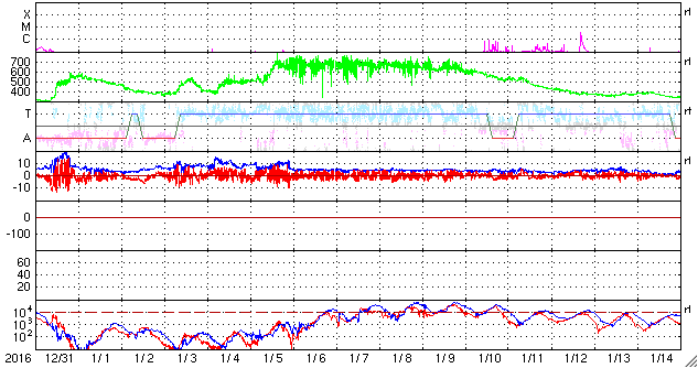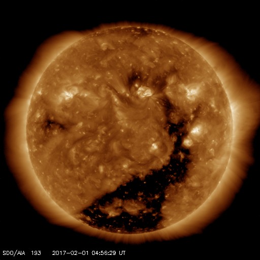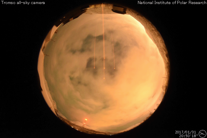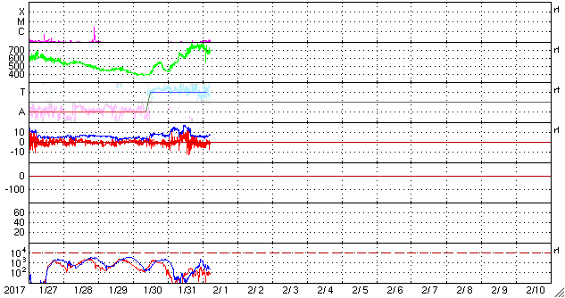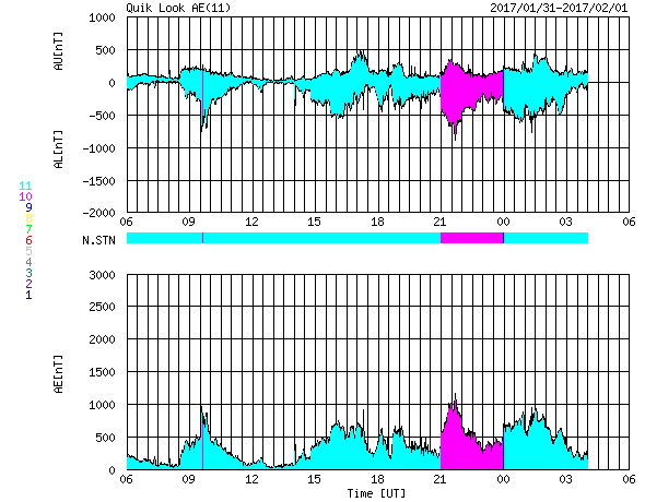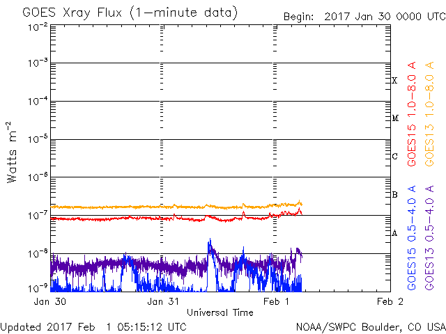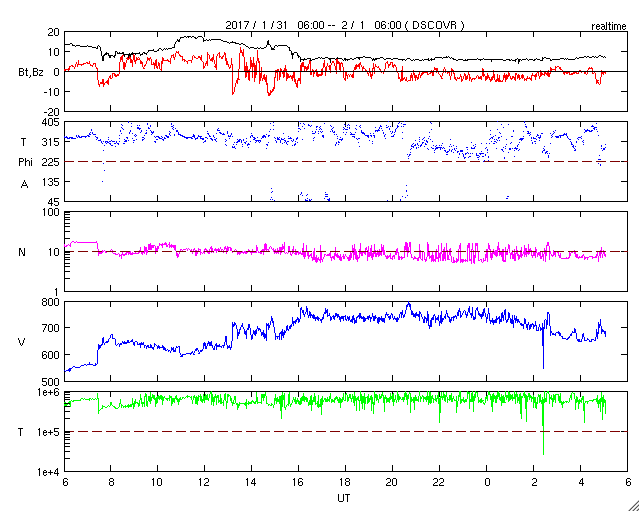 2017/ 2/ 1 14:14 更新 太陽風の速度は750km/秒に高まりました。磁気圏の活動も強まっています。 担当 篠原 500km/秒に高まっていた太陽風の速度は、 31日17時(世界時31日8時)には、600km/秒へ高まり、 1日1時(世界時31日16時)には、750km/秒に達しました。 そのまま、今朝まで750km/秒を保ちましたが、 現在は、660km/秒へ一段下がっています。 太陽風の磁場強度は、 速度が高まる頃は、15nT前後に強まっていましたが、 その後は、6nTと平均的な状態で安定しています。 太陽風が強まって、磁気圏の活動も活発化しています。 AE指数は、1000nTに達する大きな変化が繰り返し発生しています。 世界時31日21〜22時の、 1000nTに達する変化が発生した頃のオーロラの様子を、 ノルウェー・トロムソの全天カメラの動画で紹介します。 残念ながら雲が目立つ天候ですが、 その間から、強いオーロラの輝きを見ることができます。 27日周期の図の前周期を参考にすると、 高速太陽風の最も強い領域に入っているようです。 引き続き、高速風とオーロラの活動に注目して下さい。 太陽は、東の2630群が見えなくなる一方、 中央部に2632群が新しく発生しています。 X線のグラフには目立った変化はなく、 太陽は穏やかです。