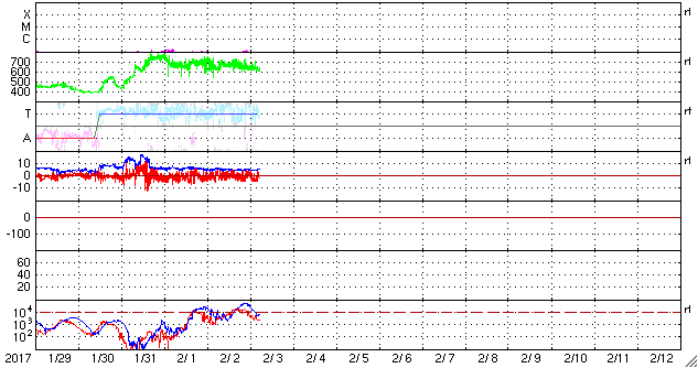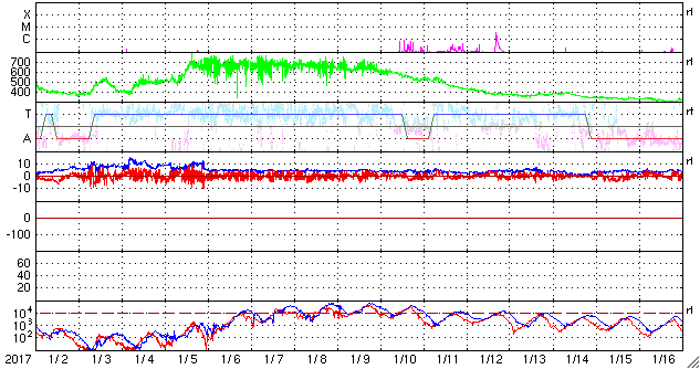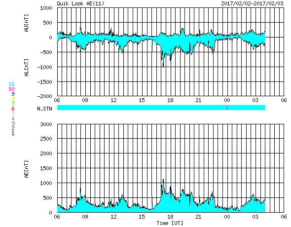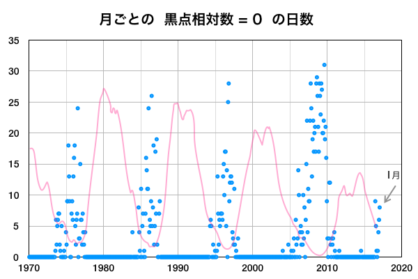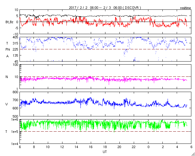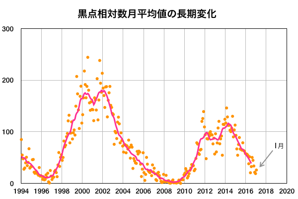 2017/ 2/ 3 14:37 更新 太陽風は、600km/秒の高速風が続いています。1月の黒点相対数は 25.8 でした。 担当 篠原 WDC-SILSOより、 1月の黒点相対数は、25.8 と発表されました。 1月は、4日から11日にかけて黒点数0の日が続き、 前半の黒点数は低調だったのですが、 後半は、ほとんどの日で30を超える状態が続き、 全体としては、前月の18.9を上回る結果となりました。 グラフ全体を見れば、 極小へ向かう減少の流れの中にあるのですが、 1月下旬からの、黒点がやや目立つ状態がどこまで続くのか、 そちらにも注目しています。 1月の無黒点の日は、8日ありました。 前半に集まっていますが、 数字としては前月よりも増えています。 現在の太陽風は、速度は少し下がったものの、 依然、600km/秒と高い速度を保っています。 磁場強度も、5nTと平均的な値が続いていて、 高速風の領域は、まだ中盤にあるようです。 太陽風磁場の南北成分は、 振れ幅は小さいですが、比較的南寄りで推移しています。 このため、磁気圏の活動も高まった状態が続き、 AE指数は、500nT前後の中規模の変化が続いています。 太陽は、昨日新しく現れた黒点に、 2633群と番号が付いています。 しかし、今日の写真では、既にかなり見にくくなっています。 放射線帯の高エネルギー電子は、 10,000を超えて、高まった状態が続いています。 前周期は、100,000には届きませんでしたが、 今回はどうなるでしょうか。 ![]() 太陽黒点相対数の長期変化。1月の黒点相対数は 25.8 でした。 (c) 黒点データ:WDC-SILSO、作図:宇宙天気ニュース ![]() 1970年以降の太陽黒点相対数の長期変化。 (c) 黒点データ:WDC-SILSO、作図:宇宙天気ニュース ![]() 1970年以降の月毎の無黒点の日数。 (c) 黒点データ:WDC-SILSO、作図:宇宙天気ニュース ![]() SDO衛星のAIA193カメラによる太陽コロナの様子 (c) SDO (NASA) ![]() SDO衛星による太陽の可視光写真。マウスの矢印を写真に重ねると、黒点番号付きの写真に切り替わります。 (c) SDO (NASA) ![]() DSCOVRが観測した太陽風の磁場(1番上の枠、黒線は全体の強度、赤線は南北成分) および、太陽風の密度(3番目の紫線)、速度(4番目の青線) (c) データ:NOAA/SWPC、作図:宇宙天気ニュース ![]() リアルタイムAE指数 下段のAEグラフの値が高くなると、オーロラ活動が活発化しています。 (c) 京都大学, NICT ![]() 27日の太陽周期に合わせたデータプロット 太陽が同じ面を地球に向けていた27日前の変化から、今後を予想することができます。 (c) 作図:宇宙天気ニュース