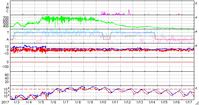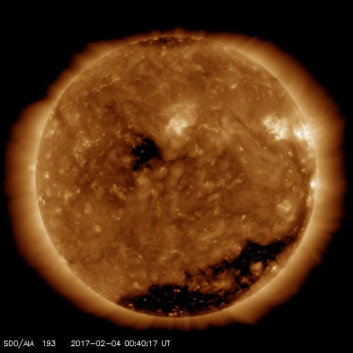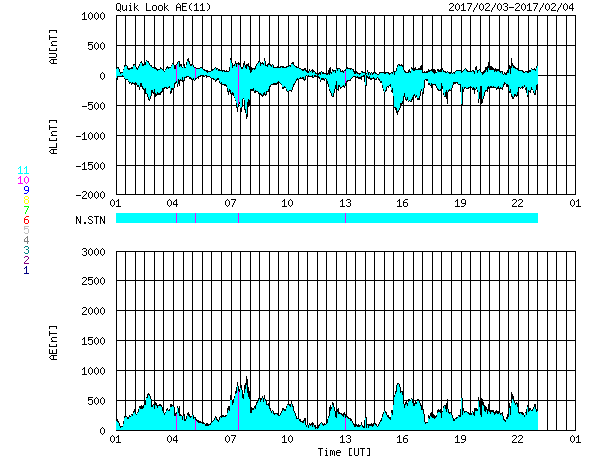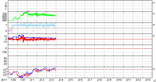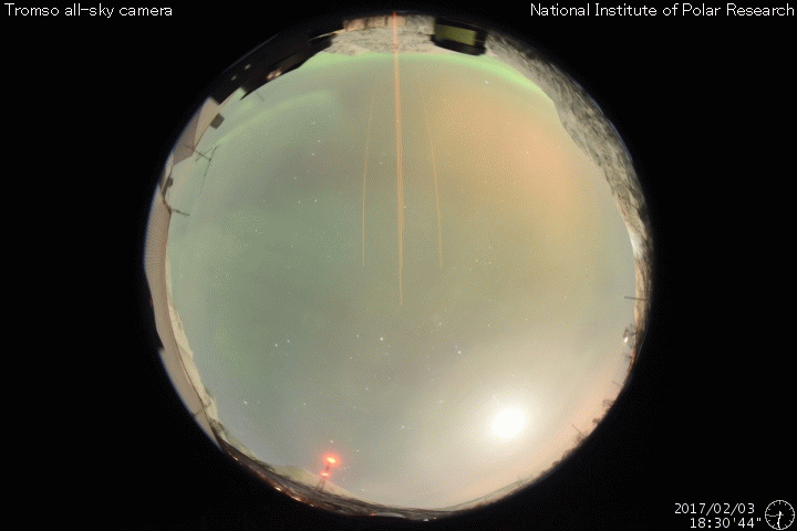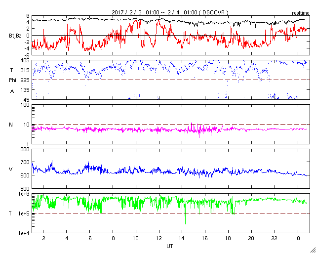 2017/ 2/ 4 09:57 更新 600km/秒の高速太陽風が続き、磁気圏も活動的です。 担当 篠原 太陽風は、600〜650km/秒と高い速度が続いています。 DSCOVR衛星のグラフの前半は、 上下しながら650km/秒近い高めの速度が続いていますが、 後半になると上下の変化が減り、 600km/秒付近で落ち着くようになっています。 高速風の領域も、後半に向かっているのでしょう。 太陽風の磁場強度も、5nTから4nTへ少し下がっています。 南北成分は、南寄りの傾向が見られ、 磁気圏の活動も、高まった状態が続いています。 オーロラの活動度を示すAE指数のグラフは、 500nT前後の小中規模の変化が一日にわたって続いています。 世界時3日19〜20時頃のオーロラの様子を、 ノルウェー・トロムソの全天カメラの動画で紹介します。 あまり派手な変化はありませんが、 このような活動が、この前後の時間もずっと続いている印象です。 SDO衛星AIA193を見ると、 南半球のコロナホールも、西に遠ざかりつつあります。 高速太陽風は、次第に終わりに向かって行くでしょう。 太陽は、2633黒点群はほとんど見えなくなり、 2629、2632群も、西の端に近付いています。 X線グラフの変化もなく、太陽はとても穏やかです。 放射線帯の高エネルギー電子は、 10,000を超えて高まった状態が続いていますが、 変化は落ちついています。 ![]() ノルウェー・トロムソの全天カメラにより撮影された、世界時3日19〜20時頃のオーロラ。 (c) 国立極地研究所、(動画加工 : 宇宙天気ニュース) ![]() SDO衛星のAIA193カメラによる太陽コロナの様子 (c) SDO (NASA) ![]() SDO衛星による太陽の可視光写真。マウスの矢印を写真に重ねると、黒点番号付きの写真に切り替わります。 (c) SDO (NASA) ![]() DSCOVRが観測した太陽風の磁場(1番上の枠、黒線は全体の強度、赤線は南北成分) および、太陽風の密度(3番目の紫線)、速度(4番目の青線) (c) データ:NOAA/SWPC、作図:宇宙天気ニュース ![]() リアルタイムAE指数 下段のAEグラフの値が高くなると、オーロラ活動が活発化しています。 (c) 京都大学, NICT ![]() 27日の太陽周期に合わせたデータプロット 太陽が同じ面を地球に向けていた27日前の変化から、今後を予想することができます。 (c) 作図:宇宙天気ニュース