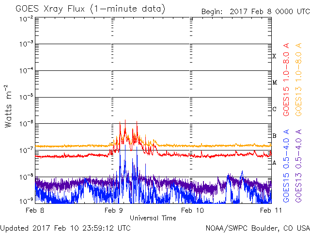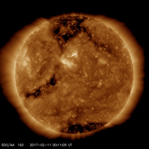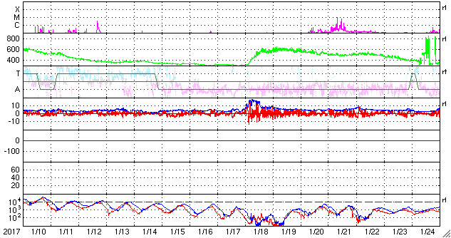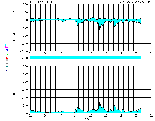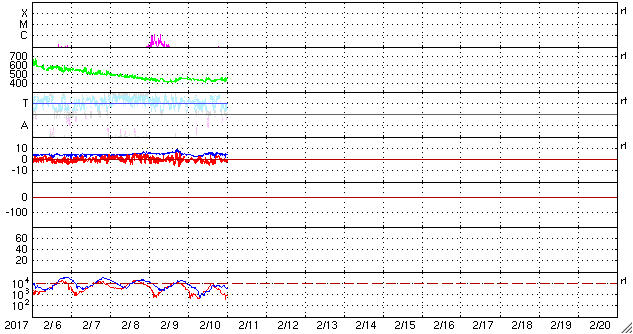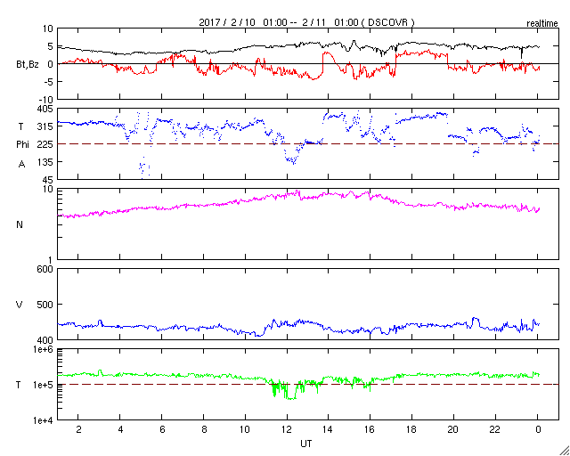 2017/ 2/11 09:20 更新 太陽風は平均的な状態ですが、磁気圏はやや活動的です。 担当 篠原 太陽風は、430km/秒と平均的な速さで安定しています。 磁場強度も、5nTと平均的な値です。 磁場の南北成分は、 -3nT程度ですが、南向きの変化が頻繁に見られ、 オーロラの活動度を示すAE指数のグラフは、 500nTに達する中規模の変化が、3回ほど発生しています。 27日周期の図の前周期を見ると、 太陽風の速度は、1月14日に、 400km/秒台から300km/秒台へ一段と下がっています。 今回も、これからより遅くなっていくのでしょうか。 一方、SDO衛星AIA193では、 太陽の東側(左側)の赤道域に、 コロナホールの暗い影が細長く見えています。 27日前の太陽と比較すると、 コロナホールの広がりは、少し狭くなっているようです。 2月15日頃に始まると予想される高速太陽風の変化は、 前周期より弱くなるかもしれません。 2635黒点群は、太陽のちょうど中央部に見えていますが、 X線グラフは変化がなく、太陽はとても穏やかです。 放射線帯の高エネルギー電子は、更に減少して、 GOES13、15の両衛星で、10,000を割っています。