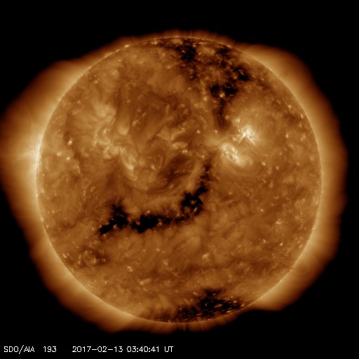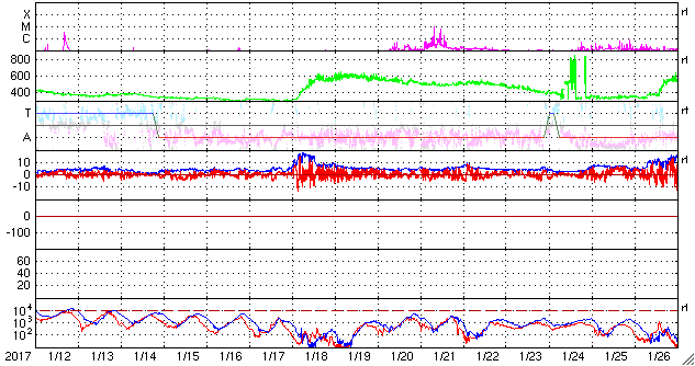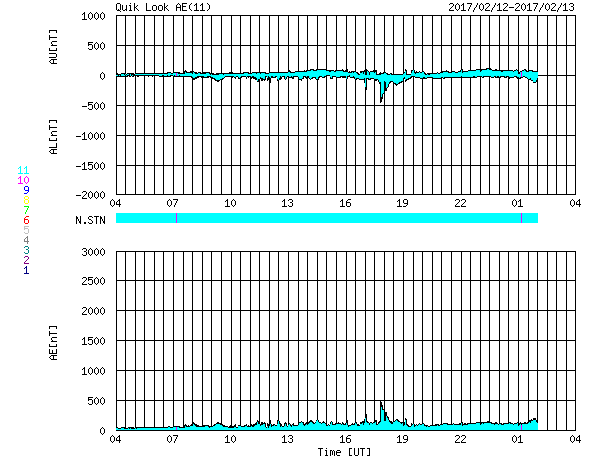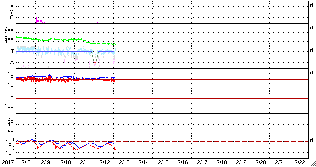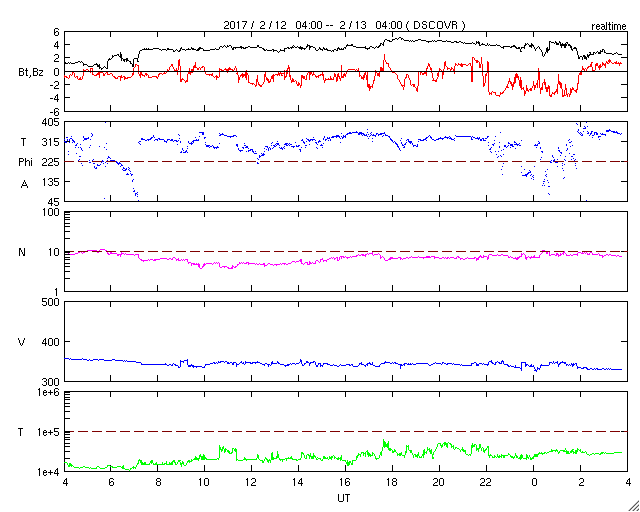 2017/ 2/13 12:55 更新 太陽風は更に低速になり、磁気圏も穏やかです。 担当 篠原 太陽風の速度は、330km/秒と更に低速になっています。 磁場強度も、3〜4nTとやや弱い値です。 昨日のデータから、 太陽風磁場のセクターの切り替わりが到来したと考えたのですが、 その後、元の状態に戻っています( T→A→T )。 この辺りも、前周期とは様子が変わっているようです。 磁気圏は静穏で、 AE指数のグラフは、一時的に小規模の変化が起きている程度です。 SDO衛星AIA193の太陽写真では、 ちょうど太陽の中央部に、コロナホールが広がっています。 太陽の中央線付近から地球に向かって吹き出している高速の太陽風は、 3日後の16日くらいに地球に到来していると考えられます。 前周期からの変化も含めて、 今後の太陽風の推移に注目してください。 太陽は、目立ったフレアはなく、 穏やかな状態が続いています。 ![]() SDO衛星のAIA193カメラによる太陽コロナの様子 (c) SDO (NASA) ![]() SDO衛星による太陽の可視光写真。マウスの矢印を写真に重ねると、黒点番号付きの写真に切り替わります。 (c) SDO (NASA) ![]() DSCOVRが観測した太陽風の磁場(1番上の枠、黒線は全体の強度、赤線は南北成分) および、太陽風の密度(3番目の紫線)、速度(4番目の青線) (c) データ:NOAA/SWPC、作図:宇宙天気ニュース ![]() リアルタイムAE指数 下段のAEグラフの値が高くなると、オーロラ活動が活発化しています。 (c) 京都大学, NICT ![]() 27日の太陽周期に合わせたデータプロット 太陽が同じ面を地球に向けていた27日前の変化から、今後を予想することができます。 (c) 作図:宇宙天気ニュース