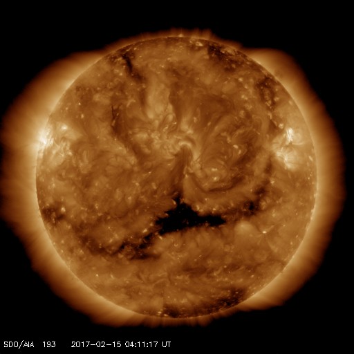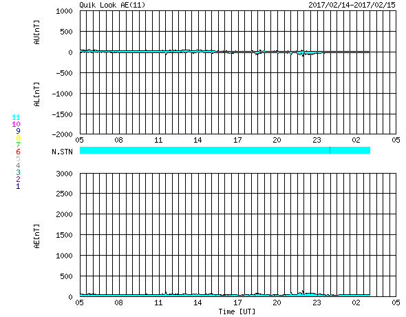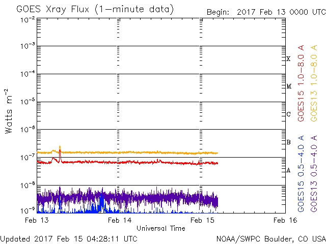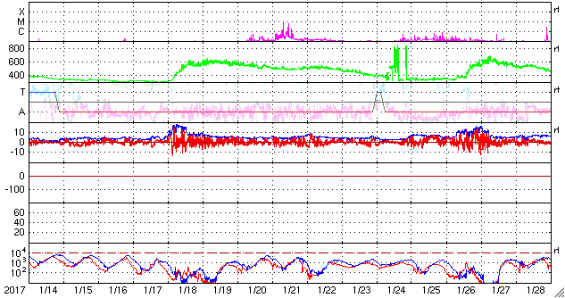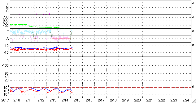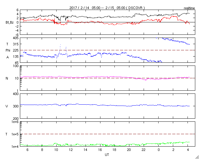 2017/ 2/15 13:27 更新 太陽風は300km/秒に下がっています。磁気圏も静かです。 担当 篠原 太陽風の速度は、300km/秒に下がり、 更に遅い風になっています。 磁場強度は、2nTから4nTへ少し上がっていますが、 変化の幅としては小さく、 次の高速風へ繋がるような変化かどうかは分かりません。 一方、27日周期の図では、 前周期の高速風の到来から1日ほど経過したところで、 そろそろ変化が始まってもよい頃です。 太陽風磁場の南北成分は、 0nT付近から、やや北寄りで推移しています。 速度が下がっていることもあり、磁気圏はとても静穏で、 AE指数のグラフは、変化が見られません。 太陽もとても静かで、X線のグラフは変化のない状態です。 東端に新しい黒点が現れています。