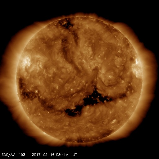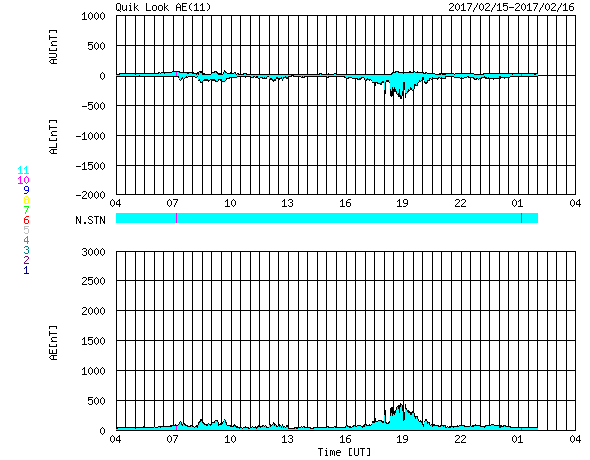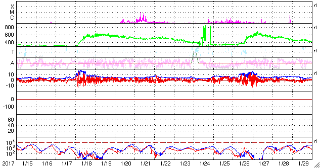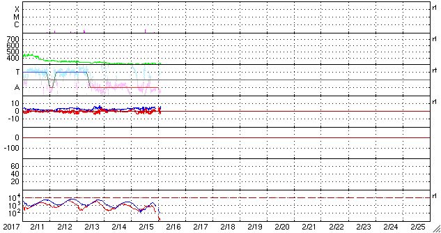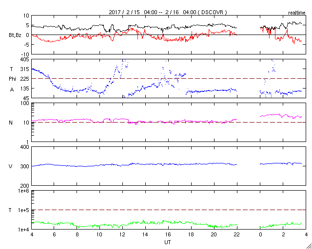 2017/ 2/16 12:58 更新 300km/秒の低速の太陽風が続いています。 担当 篠原 太陽風の速度は、300km/秒と低速の状態が続いています。 磁場強度も、4〜5nTと平均的な状態で安定しています。 SDO衛星AIA193を見ると、 南半球を東西に伸びるコロナホールの先頭(右端)は、 太陽の西の端に近づいていて、 影響は見え始めても良い頃です。 27日周期の図で前周期と比べると、 高速風の始まりは、既に2日ほど遅くなっています。 今後、太陽風の変化は到来すると思われますが、 始まりのタイミングを含め、推移に注目してください。 磁気圏も、基本的には静穏な状態が続いています。 オーロラの活動度を示すAE指数のグラフは、 一時的に400nTの高まりを記録していますが、 これは、太陽風の磁場が南向きにやや強まった影響のようです。 今後、高速太陽風が到来すると、 磁気圏の活動もより高まっていくでしょう。 太陽は、東端に現れた新しい黒点に、 2636群と番号が付けられています。 X線グラフは特に変化はなく、太陽も穏やかな状態が続いています。