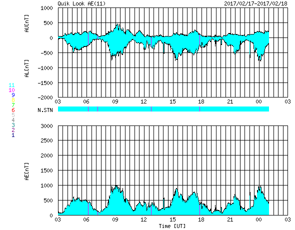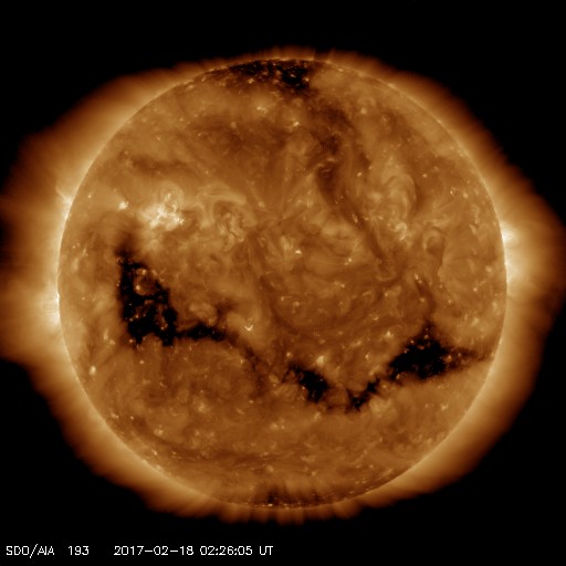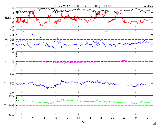 2017/ 2/18 11:32 更新 高速太陽風が続き、磁気圏の活動も高まっています。 担当 篠原 太陽風は、500km/秒前後の高速の風が続いています。 磁場強度も、5〜10nTとやや強まった値で推移していて、 高速風領域の前半という印象です。 磁場の南北成分は、 +5nTから -5nTの間を、南北にやや大きく変動しています。 このため、磁気圏の活動も高まっていて、 AE指数のグラフは、500〜1000nTの中規模の活動が、 繰り返すように発生しています。 極域では、にぎやかなオーロラの活動が 見えているのではないでしょうか。 SDO衛星AIA193では、コロナホールは、 西の端(右端)から東の端(左端)近くまで、 細長く横方向に伸びています。 このまま、一週間以上太陽風の高まりが続くかもしれません。 太陽は、東端から活動的な領域が近づいているようです。 規模は小さいと思いますが、黒点が現れるでしょうか。 ![]() SDO衛星のAIA193カメラによる太陽コロナの様子 (c) SDO (NASA) ![]() SDO衛星による太陽の可視光写真。マウスの矢印を写真に重ねると、黒点番号付きの写真に切り替わります。 (c) SDO (NASA) ![]() DSCOVRが観測した太陽風の磁場(1番上の枠、黒線は全体の強度、赤線は南北成分) および、太陽風の密度(3番目の紫線)、速度(4番目の青線) (c) データ:NOAA/SWPC、作図:宇宙天気ニュース ![]() リアルタイムAE指数 下段のAEグラフの値が高くなると、オーロラ活動が活発化しています。 (c) 京都大学, NICT ![]() 27日の太陽周期に合わせたデータプロット 太陽が同じ面を地球に向けていた27日前の変化から、今後を予想することができます。 (c) 作図:宇宙天気ニュース