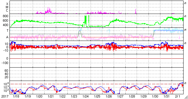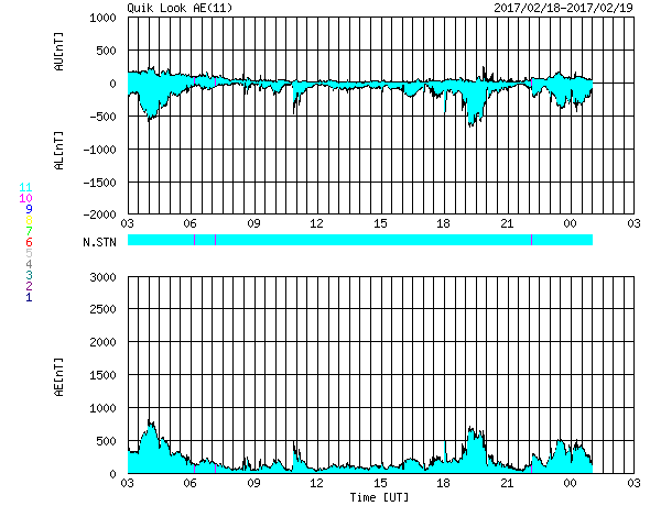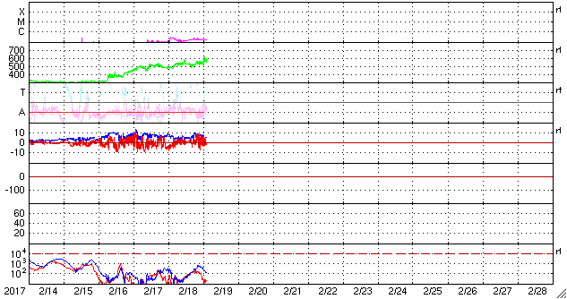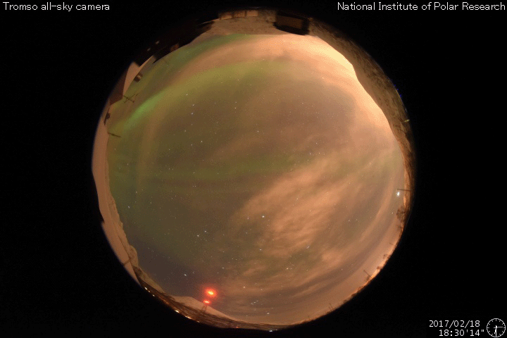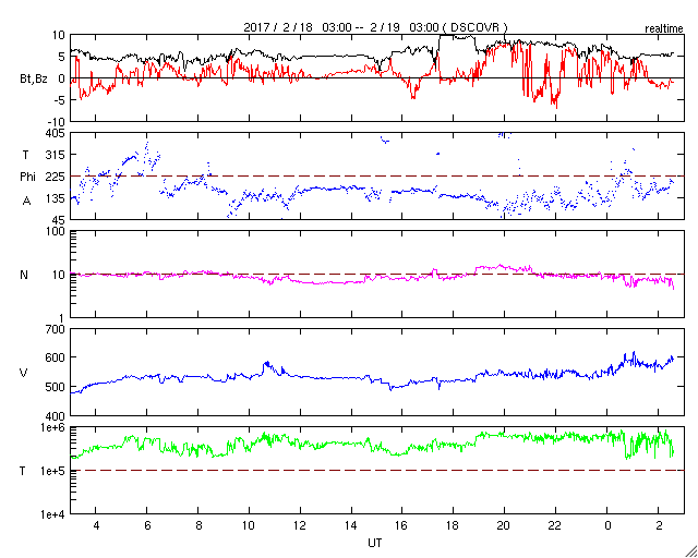 2017/ 2/19 11:41 更新 太陽風の速度は600km/秒近くまで高まっています。 担当 篠原 太陽風の速度は、550km/秒へ上がり、 より高速の風になっています。 グラフの最後では、590km/秒に達しています。 太陽風の磁場強度は、5nTから一時的に10nTに強まって、 現在は、再び5nTと平均的な強度に戻っています。 太陽風磁場の南北成分は、 やや北寄りの傾向に変わっていますが、 時々、南向きに変化して、磁気圏の活動を高めています。 このため、AE指数のグラフは、 変化の小さい時間帯が目立っていますが、 時々、500〜700nTくらいの中規模の変化も発生しています。 その中の、世界時18日19〜20時頃のオーロラ活動の高まりを、 ノルウェー・トロムソの全天カメラの動画で紹介します。 空全体を覆うようなオーロラの光が、活発に動いて見えます。 SDO衛星AIA193では、太陽の東側(左側)に、 やや大きいコロナホールの広がりが見えています。 27日周期の図の前周期、 1月26〜28日に高速の太陽風をもたらした領域です。 今回も、4日後の2月23日前後に、 この領域の影響が強まりそうです。 太陽は、東端(左端)の南半球側から、 新しい黒点が顔を出しています。 SDO衛星のAIA193の動画では、 北半球側の東端にも活動的な領域があるようで、 この後、こちらからも黒点が現れるかもしれません。 ![]() ノルウェー・トロムソの全天カメラにより撮影された、世界時18日19〜20時頃のオーロラ。 (c) 国立極地研究所、(動画加工 : 宇宙天気ニュース) ![]() SDO衛星のAIA193カメラによる太陽コロナの様子 (c) SDO (NASA) ![]() SDO衛星による太陽の可視光写真。マウスの矢印を写真に重ねると、黒点番号付きの写真に切り替わります。 (c) SDO (NASA) ![]() DSCOVRが観測した太陽風の磁場(1番上の枠、黒線は全体の強度、赤線は南北成分) および、太陽風の密度(3番目の紫線)、速度(4番目の青線) (c) データ:NOAA/SWPC、作図:宇宙天気ニュース ![]() リアルタイムAE指数 下段のAEグラフの値が高くなると、オーロラ活動が活発化しています。 (c) 京都大学, NICT ![]() 27日の太陽周期に合わせたデータプロット 太陽が同じ面を地球に向けていた27日前の変化から、今後を予想することができます。 (c) 作図:宇宙天気ニュース