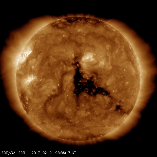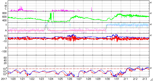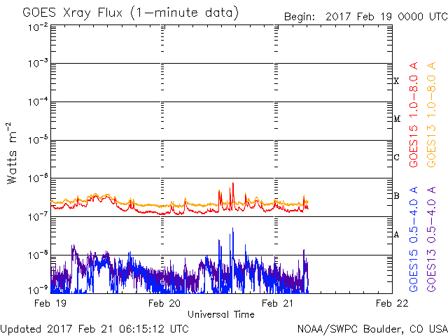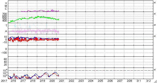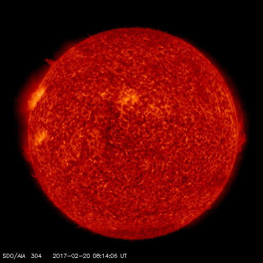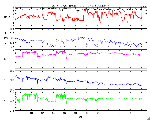 2017/ 2/21 15:15 更新 Bクラスの小さいフレアが増えています。太陽風はやや高速です。 担当 篠原 昨日に続いて、今度は太陽の東端で フィラメントの噴出が発生しています。 SDO衛星AIA304による動画を掲載します。 真横から見ているので、 噴き上がるガスのループがきれいに見えています。 横へ向かっているため、地球地球への影響はないでしょう。 太陽の東側に新しく現れた黒点は、 2638群と番号が付けられています。 Bクラスの小さい活動を頻繁に起こしていて、 X線のグラフはちょっとにぎやかになっています。 Cクラスに達するフレアは発生するでしょうか。 太陽風は、速度が520km/秒から450km/秒へ下がり、 やや高速くらいの風になっています。 27日周期の図の前周期を見ると、 今日にあたる1月25日は、 既に300km/秒台の低速風に変わっています。 コロナホールの広がりの変化が、 この違いをもたらしているのでしょう。 太陽風の磁場強度は、5nTと平均的な状態です。 南北成分は、南に振れたり、北に振れたり変化していて、 南を向いた頃に、磁気圏の小規模の活動を起こしています。 AE指数のグラフは、300nTほどの変化が発生しています。 太陽風は、明日以降、 コロナホールの影響で再び強まりそうです。 磁気圏の活動の高まりにも注目して下さい。