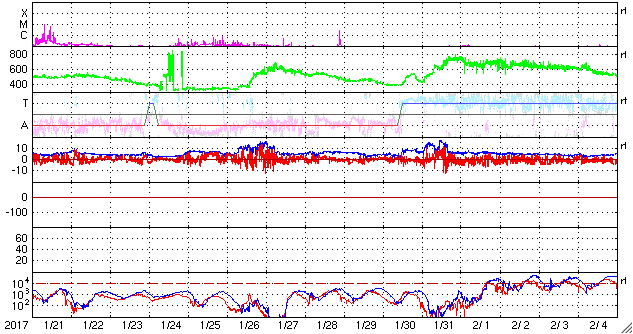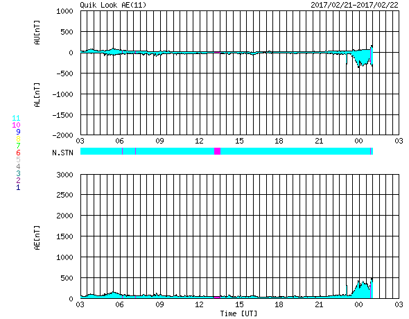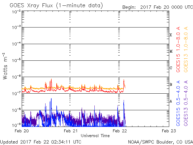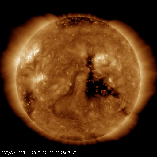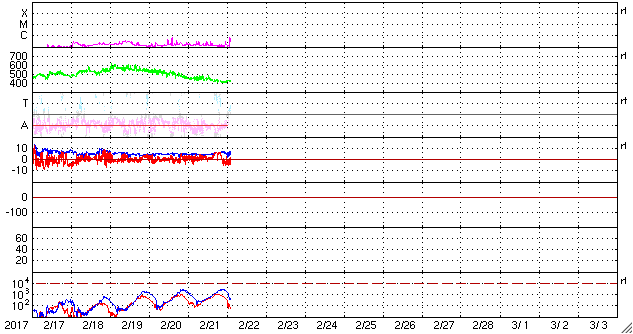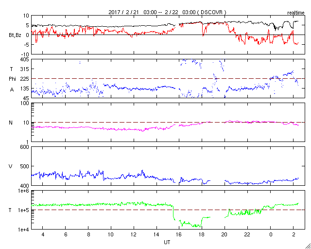 2017/ 2/22 11:32 更新 太陽風は平均的な速さです。この後、高速風が始まりそうです。 担当 篠原 太陽風の速度は、420km/秒くらいまで下がり、 平均的な速さに戻っています。 磁場強度は、5nTから7nTへやや強まっています。 磁場の南北成分は、 グラフの中盤までは北向きになっていて、 磁気圏も静穏でしたが、 後半からは南向きに振れる様に変わり、 AE指数も400nT程度の小規模の活動が現れ始めています。 SDO衛星AIA193の太陽写真では、 中央部のコロナホールが西側に進んで、 影響が現れ始めても良い頃です。 27日周期の図の前周期でも、 1月26日から速度の高まりが始まっています。 前周期は、600km/秒に達する高速太陽風が到来しました。 太陽は、2638黒点群でBクラスの小さいフレアが続いています。 今朝、B6.8のフレアも発生しています。 もう少し活動の規模が大きくなると、Cクラスに達しそうです。