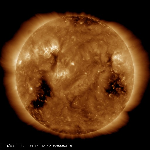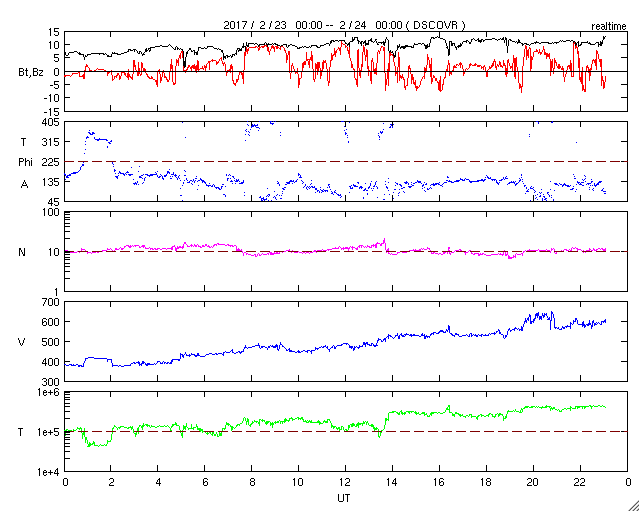 2017/ 2/24 08:12 更新 高速の太陽風が到来し、速度は600km/秒まで高まっています。 担当 篠原 昨日のニュースの直後に、太陽風の速度は上昇を開始し、 23日23時(世界時23日14時)頃、 500km/秒に達して高速の風になりました。 その後も上昇は続いて、 今朝、24日5時(世界時23日20時)には、 600km/秒まで上がっています。 太陽風の磁場強度も、昨日のニュース以降、 10nT前後に強まった状態が続いています。 27日周期の図を見ると、 前周期から半日ほど遅れて高速風の到来になりました。 前周期は600km/秒まで高まっていたのですが、 今のところ、今回も同程度の速さに達しています。 太陽風磁場の南北成分は、 比較的北寄りに変化しているようです。 その中で、-5nTに達する南向きの変化も起きています。 この影響で磁気圏の活動もやや高まっていて、 AE指数は、300〜700nTの小中規模の変化が、 間をあけて発生しています。 前周期の高速風は、2日半ほど続きました。 コロナホールの規模は同じくらいなので、 今回も3日程度の継続期間になるのではないでしょうか。 SDO衛星AIA193の写真には、 次のコロナホールも太陽の東側(左側)に見えています。 5日後くらいから、こちらの影響で再び太陽風は強まりそうです。 太陽では、2638黒点群がやや活動的な状態を保っています。 今朝、24日6時(世界時23日21時)には、 C1.3の小規模フレアを起こし、 その他にもBクラスの小さいフレアを数回発生させています。 一方、黒点は小さくなっているようで、 フレアの活動も次第に弱まっていきそうです。 ![]() SDO衛星のAIA193カメラによる太陽コロナの様子 (c) SDO (NASA) ![]() SDO衛星による太陽の可視光写真。マウスの矢印を写真に重ねると、黒点番号付きの写真に切り替わります。 (c) SDO (NASA) ![]() DSCOVRが観測した太陽風の磁場(1番上の枠、黒線は全体の強度、赤線は南北成分) および、太陽風の密度(3番目の紫線)、速度(4番目の青線) (c) データ:NOAA/SWPC、作図:宇宙天気ニュース ![]() リアルタイムAE指数 下段のAEグラフの値が高くなると、オーロラ活動が活発化しています。 (c) 京都大学, NICT ![]() 27日の太陽周期に合わせたデータプロット 太陽が同じ面を地球に向けていた27日前の変化から、今後を予想することができます。 (c) 作図:宇宙天気ニュース