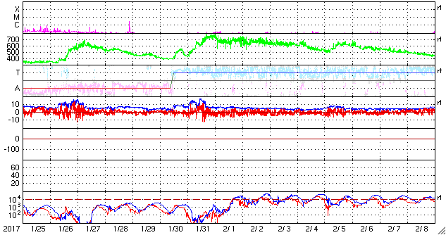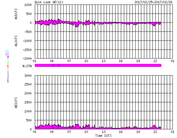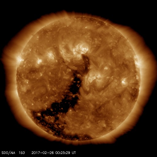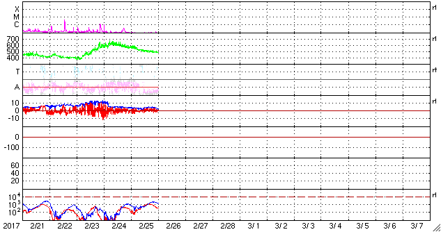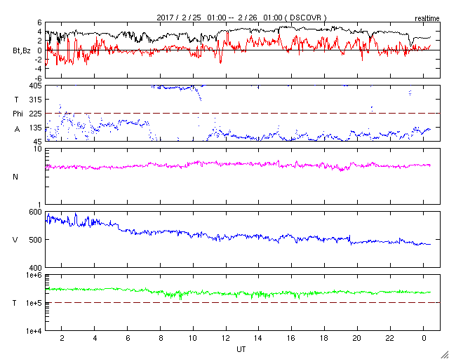 2017/ 2/26 09:32 更新 高速の太陽風は終わりに近付き、磁気圏も穏やかになっています。 担当 篠原 太陽風の速度はゆっくりと低下が続き、 480km/秒と高速の状態が終わりかけています。 前周期と同じく、高速風は3日弱の継続期間となりそうです。 太陽風の磁場強度も2〜4nTとやや弱い状態です。 27日周期の図の前周期を参考にすると、 この後、磁場の大まかな方向が切り替わるセクター境界を通過し、 セクターのグラフが「A」から「T」へ変わりそうです。 磁場の南北成分は、0nTからやや北寄りの傾向になっています。 このため、磁気圏の活動度は低下して、 AE指数は小さい変化が時々見られる程度になっています。 高速風も終わりに近付き、 オーロラの活動は穏やかになりそうです。 一方、SDO衛星AIA193の太陽写真では、 コロナホールが太陽の中央から南半球に向かって、 縦に太く伸びています。 3日後くらいから、この領域の影響で太陽風が強まりそうです。 前周期は、1月31日から2月8日まで 一週間以上にわたって高速風が続きました。 今回はどのような風がやって来るでしょうか。 太陽は、西に現れた新しい黒点に2639群と番号がつき、 東側にも小さい黒点が出現しているようです。 X線のグラフに変化はなく、活動は穏やかです。