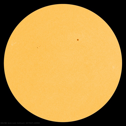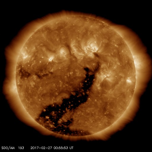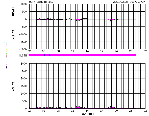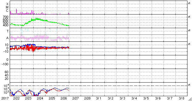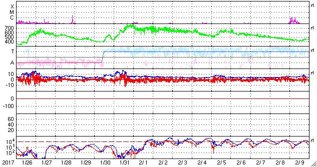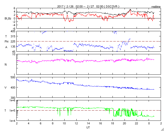 2017/ 2/27 10:10 更新 太陽風の速度は380km/秒に下がり、やや低速になっています。 担当 篠原 昨日のニュース以降も、太陽風の速度は低下が続き、 昨日の480km/秒から、現在は380km/秒まで下がっています。 高速太陽風は終わり、やや低速の風になりかけています。 太陽風の磁場強度は、 3〜4nTとやや弱まった状態で安定しています。 南北成分は北向きに変化している時間帯が長く、 磁気圏はとても静かになっている様で、 AE指数は、小さい変化が所々に見えている程度です SDO衛星AIA193の太陽写真では、 南半球にコロナホールが広がり、 明後日くらいから、 この領域の影響で太陽風が強まりそうです。 太陽では、東側(左側)に現れた黒点に、 2640群と番号が付けられています。 2640群の黒点は、昨日よりも少し大きくなっています。 また、Bクラスの小さいフレアを起こしています。 更に活発化するかどうか、注目してください。