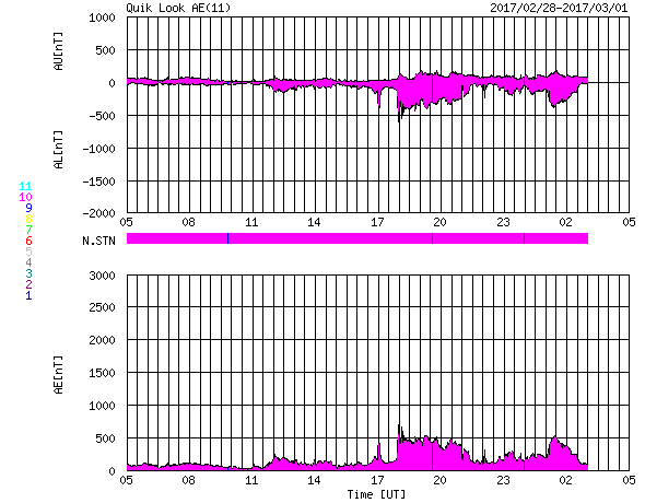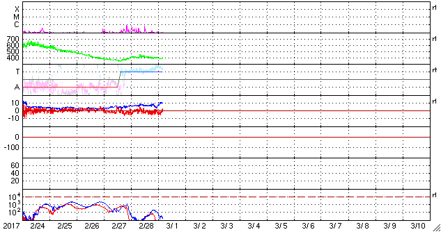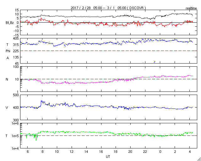 2017/ 3/ 1 13:37 更新 太陽風の速度は平均的な状態です。ニュージーランドのオーロラをどうぞ。 担当 篠原 ニュージーランド・ダニーデンの中村太一さんより、 先週の後半、2月23〜24日と24〜25日の夜に撮影された オーロラの写真をいただきました。 高速太陽風の領域がやって来て、 太陽風の速度が500km/秒を超えた頃に見られた活動です。 オーロラの活動度を示すAE指数は、 1〜2枚目の頃は、300nTと小規模でしたが、 4〜5枚目の頃は、1000nTと大きく変化しています。 中村さんによると、この2晩は、 オーロラの色の層がとても特徴的だったとのことです。 3、4枚目の写真も、街明かりと雲のため空全体が色づいていますが、 オーロラの黄色ピンク紫の色を写すことができたとのことです。 また、5枚目の緑色の小さい縦縞模様を、 現地ではピケットフェンスと呼んでいるそうで、 見事なネーミングですね。 1、2枚めでは、水面に映る星とオーロラの光も印象的です。 空よりも下の方がより明るく写っているようにすら見えます。 日本では冬が終わりに近づき、 オーロラ観望の舞台も南半球へ移りつつあるのだと感じます。 どうもありがとうございます。 現在の太陽風は、速度が400km/秒と平均的な状態で安定していて、 高速の太陽風はまだ始まっていません。 27日周期の図で前周期の始まりと比べると、 既に2日遅れています。 一方、太陽風の磁場強度は、 今朝くらいから10nTに強まっています。 速度の変化の始まりも、近づいているのかもしれません。 太陽風磁場の南北成分は、 グラフの後半から南寄りになっています。 そのため、AE指数のグラフも、 後半から弱い変化が続くようになっています。 SDO衛星AIA193の太陽写真では、 コロナホールは西半球をだいぶ進み、 影響が地球に到来しても良い頃です。 太陽は、新しい2641黒点群で、 Bクラスの小さいフレアが続いていますが、 活動度は下がってきている印象です。 ![]() ニュージーランド南島ダニーデンで、現地24日1時8分(世界時23日12時8分)に撮影されたオーロラ。 (c) 中村太一氏 ![]() ニュージーランド南島ダニーデンで、現地24日1時25分(世界時23日12時25分)に撮影されたオーロラ。 (c) 中村太一氏 ![]() ニュージーランド南島ダニーデンで、現地24日21時31分(世界時24日8時31分)に撮影されたオーロラ。 (c) 中村太一氏 ![]() ニュージーランド南島ダニーデンで、現地24日22時40分(世界時24日9時40分)に撮影されたオーロラ。 (c) 中村太一氏 ![]() ニュージーランド南島ダニーデンで、現地25日0時8分(世界時24日11時8分)に撮影されたオーロラ。 (c) 中村太一氏 ![]() SDO衛星のAIA193カメラによる太陽コロナの様子 (c) SDO (NASA) ![]() SDO衛星による太陽の可視光写真。マウスの矢印を写真に重ねると、黒点番号付きの写真に切り替わります。 (c) SDO (NASA) ![]() DSCOVRが観測した太陽風の磁場(1番上の枠、黒線は全体の強度、赤線は南北成分) および、太陽風の密度(3番目の紫線)、速度(4番目の青線) (c) データ:NOAA/SWPC、作図:宇宙天気ニュース ![]() リアルタイムAE指数 下段のAEグラフの値が高くなると、オーロラ活動が活発化しています。 (c) 京都大学, NICT ![]() 27日の太陽周期に合わせたデータプロット 太陽が同じ面を地球に向けていた27日前の変化から、今後を予想することができます。 (c) 作図:宇宙天気ニュース