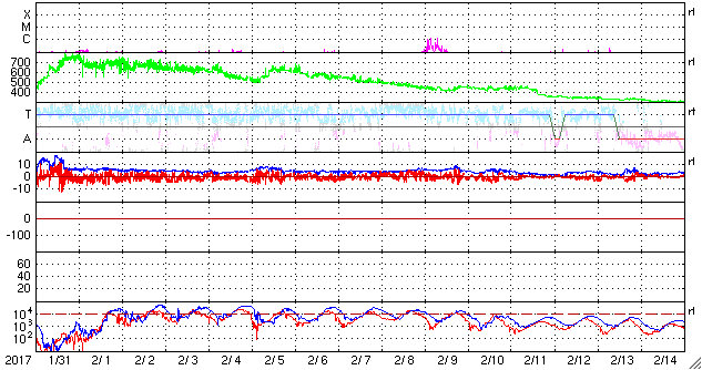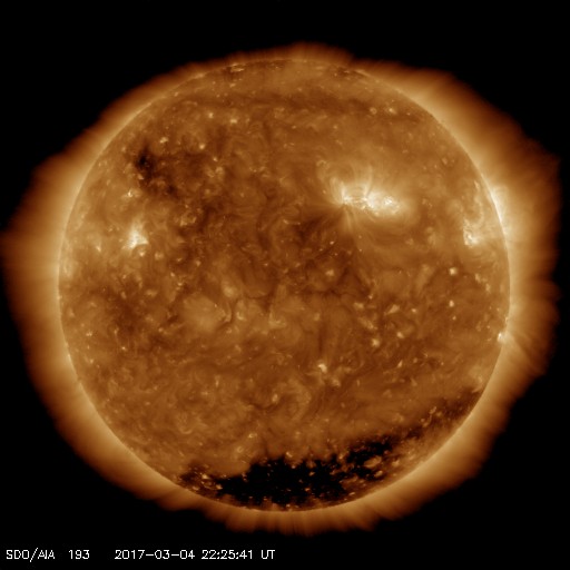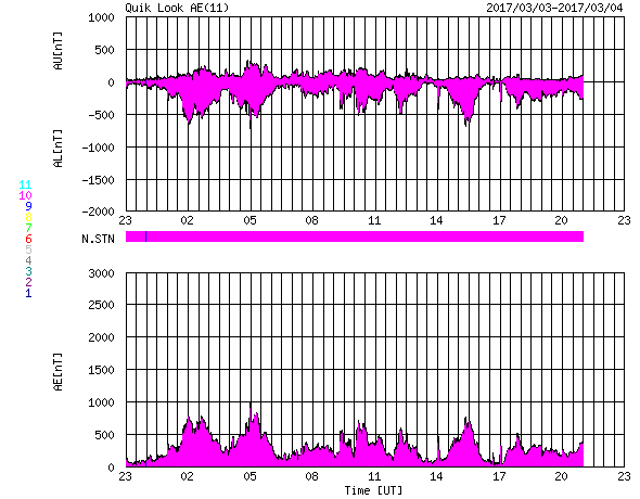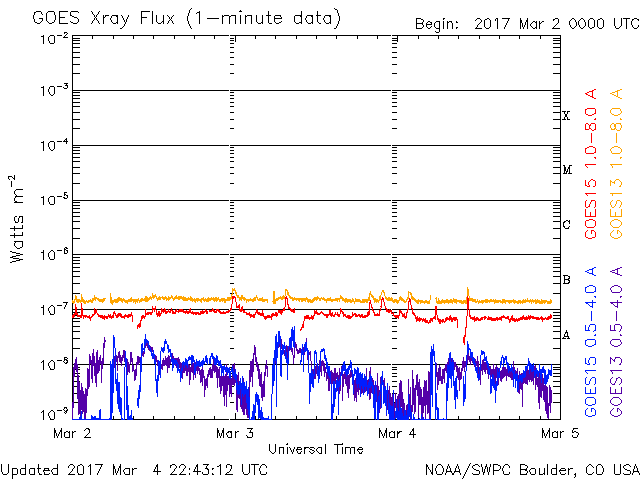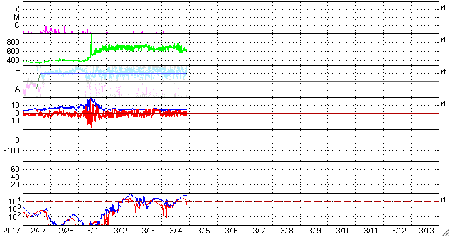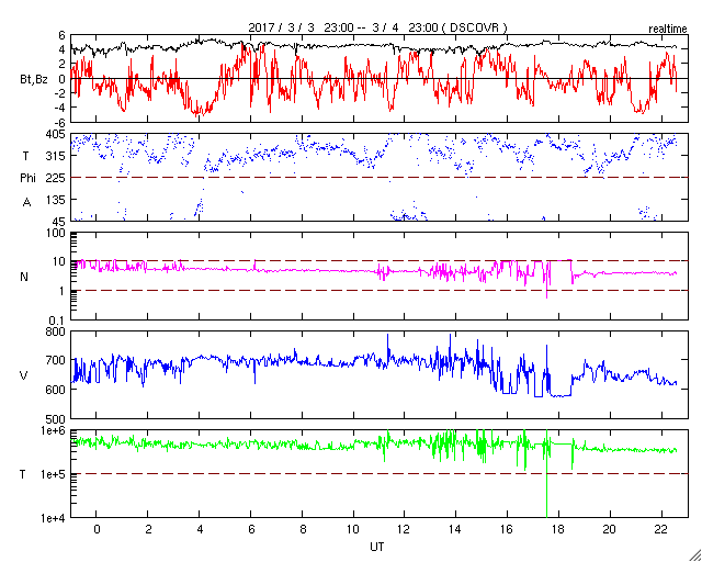 2017/ 3/ 5 07:43 更新 650〜700km/秒の高速太陽風が続き、磁気圏も活動的です。 担当 篠原 太陽風の速度は、 昨日のニュースの後、再び700km/秒に高まり、 今日に入る頃に、650km/秒へ下がるという変化をしています。 磁場強度は、4〜5nTと平均的な値ですが、 少し弱まり始めている印象です。 太陽風の速度のグラフは、最後に620km/秒へ下がっています。 高速太陽風は後半に向かっていると考えられるので、 速度はこのまま下がっていく可能性があります。 太陽風磁場の南北成分は、南北両方に変化しています。 このため、磁気圏の活動は強まった状態が続き、 AE指数は、300〜800nTの小中規模の変化が続いています。 こちらの変化の高まりも、速度が高まっている間のことなので、 残りの期間、注目してください。 太陽は、今日も黒点は見えないようです。 X線グラフの変化も特になく、穏やかです。 放射線帯の高エネルギー電子は、 2機のGOES衛星とも、数万に高まった状態です。 27日周期の図の前周期のグラフのように、 今後の減少はゆっくり進む可能性があります。 種子島ロケットコンテストは、 昨日の講演会・Workshopで無事に終了し、 今日の高速船で鹿児島に帰ります。 今日は朝から雨で、島内の観光は行きにくくなりましたが、 一昨日が好天でしたのでとても満足です。 ![]() SDO衛星のAIA193カメラによる太陽コロナの様子 (c) SDO (NASA) ![]() SDO衛星による太陽の可視光写真 (c) SDO (NASA) ![]() DSCOVRが観測した太陽風の磁場(1番上の枠、黒線は全体の強度、赤線は南北成分) および、太陽風の密度(3番目の紫線)、速度(4番目の青線) (c) データ:NOAA/SWPC、作図:宇宙天気ニュース ![]() リアルタイムAE指数 下段のAEグラフの値が高くなると、オーロラ活動が活発化しています。 (c) 京都大学, NICT ![]() 27日の太陽周期に合わせたデータプロット 太陽が同じ面を地球に向けていた27日前の変化から、今後を予想することができます。 (c) 作図:宇宙天気ニュース