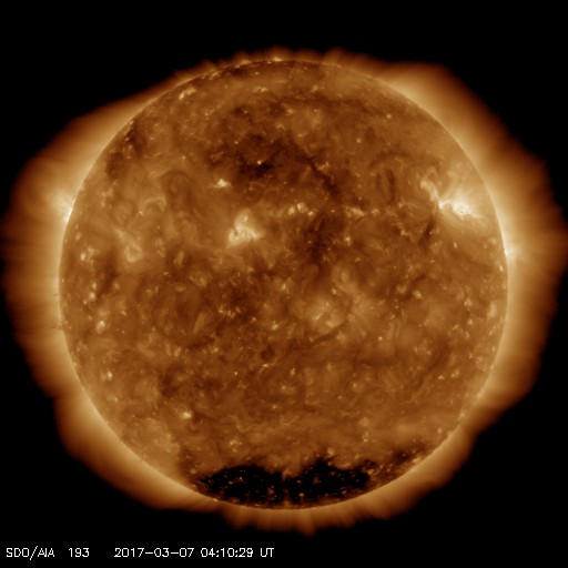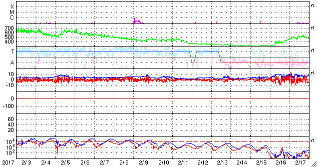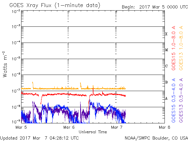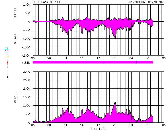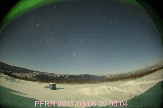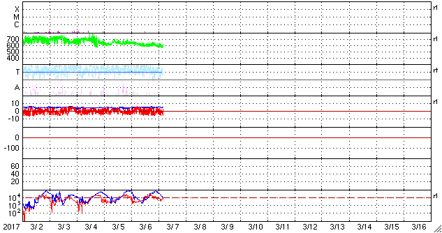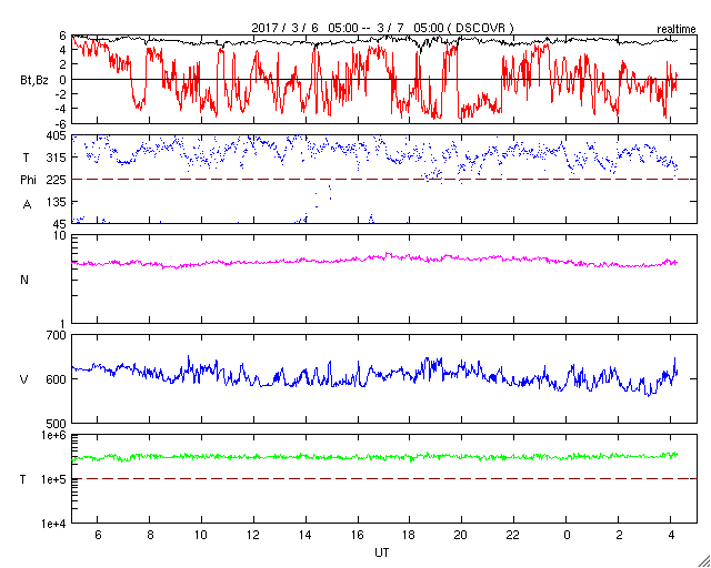 2017/ 3/ 7 13:29 更新 高速太陽風は続いていますが、速度は下がり始めています。太陽は無黒点です。 担当 篠原 太陽風は、高速の風が続いていますが、 速度はゆっくりと低下していて、昨日の630km/秒から、 現在は580km/秒ほどに下がっています。 27日周期の図の前周期の太陽風のグラフは、 既に500km/秒近くまで下がっています。 高速風の開始が遅れたのと同様に、 終わりのタイミングも遅れることになりそうです。 太陽風の磁場強度は、5nTと平均的な値で安定しています。 南北成分は、頻繁に南北に振れ、 磁気圏の活動は高まった状態が続いています。 AE指数のグラフは、800nTや1000nTを超える変化も発生しています。 昨日に続いて、アラスカ・フェアバンクスのオーロラの様子を、 オーロラカメラの動画で紹介します。 世界時6日9〜14時の変化で、 AE指数では、800nTの高まりが発生している時間帯です。 太陽風の速度は、この後も次第に低下して、 2日後くらいには高速の太陽風は終わりを迎えそうです。 太陽は、今日も無黒点です。 X線グラフも変化がなく、太陽はとても穏やかです。 放射線帯の高エネルギー電子は、 昨日と同程度に高まっています。 高速太陽風は終わりに近づいている様子なので、 高エネルギー電子も、今後は低下に向かいそうです。