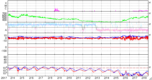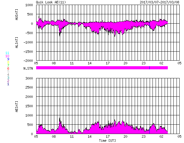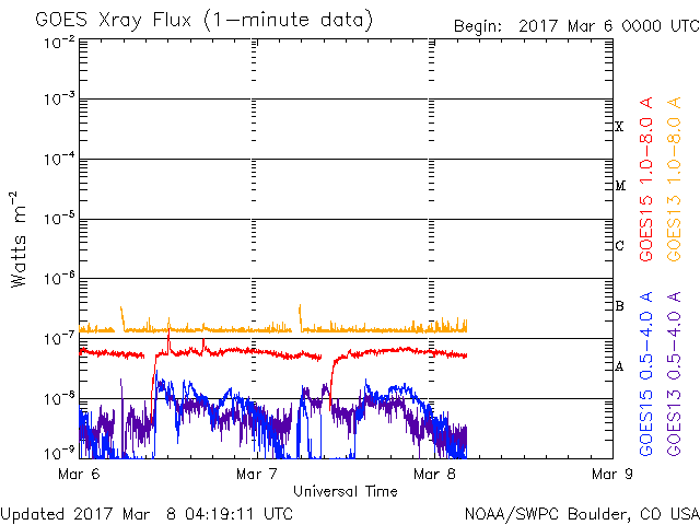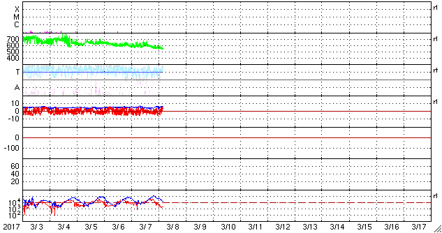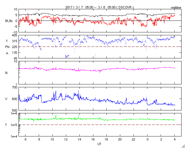 2017/ 3/ 8 13:19 更新 高速太陽風は550km/秒まで下がっています。磁気圏は活動的です。 担当 篠原 太陽風の速度は、550km/秒まで下がりましたが、 今も高速の状態は続いています。 磁場強度は、5nTと平均的な値を保っています。 磁場の南北成分は、南北双方に変化しています。 磁気圏の活動は、変化の規模は小さくなっていますが、 活発な状態は続いていて、 AE指数は、ずっと500nT前後の中規模の変化が起きています。 2月末から、国立極地研究所の昭和基地の 全天カメラ観測が再開されたようです。 オーロラの活動的な様子を、世界時7日21時頃の動画で紹介します。 撮影間隔が6秒と、 これまでのトロムソの30秒と比べるとだいぶ短くなっているので、 オーロラのより細かい動きまで見ることができます。 今後の撮影が楽しみです。 太陽は、無黒点の状態が続いています。 X線グラフも変化がなく、太陽は穏やかです。 放射線帯の高エネルギー電子は、 青線のGOES15が、10万の線に達しているようです。 赤線のGOES13も、昨日より少し多くなっています。