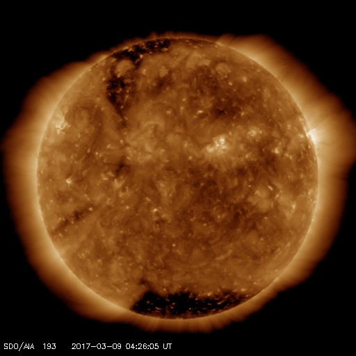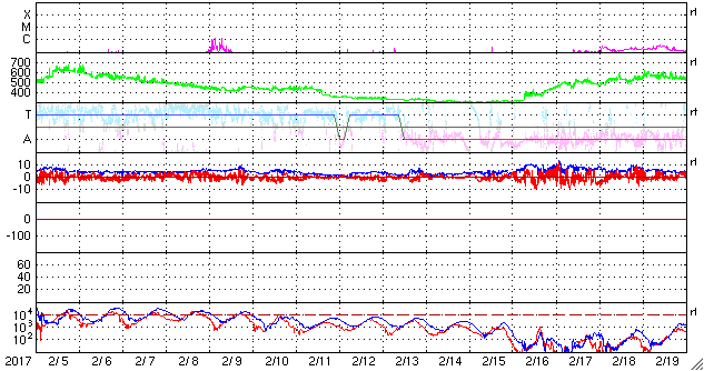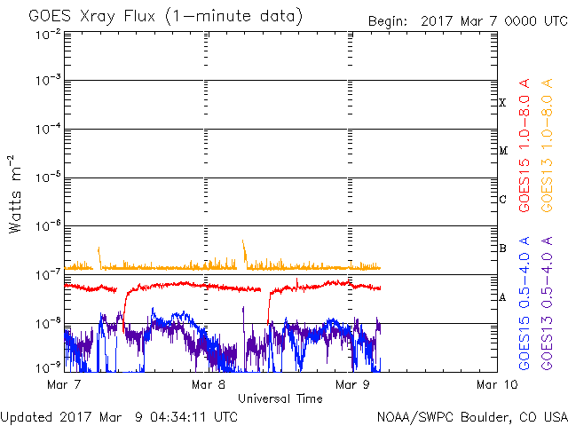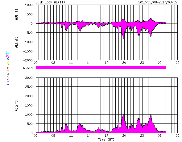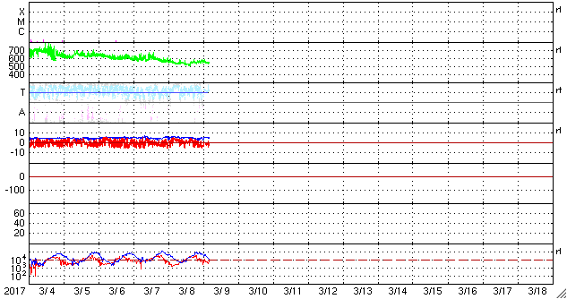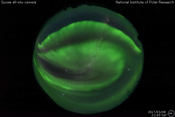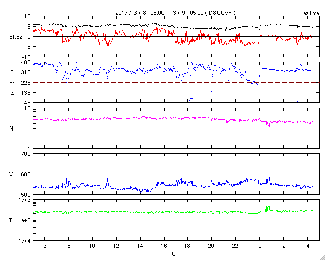 2017/ 3/ 9 13:32 更新 550km/秒の高速太陽風が続き、磁気圏の活動も活発です。 担当 篠原 太陽風の速度は、550km/秒のまま安定し、 高速の太陽風が続いています。 磁場強度も、5nTと平均的な強さで安定しています。 磁場の南北成分は、振れ幅がやや小さくなってきた様ですが、 南向きに頻繁に変化していて、 磁気圏の活動は高まった状態が続いています。 オーロラの活動度を示すAE指数のグラフは、 1000nT近い大きな変化が3回ほど発生しています。 この中の2番目の高まりにあたる、 世界時8日22時前後のオーロラの様子を、 南極・昭和基地の全天カメラの動画で紹介します。 オーロラの強い輝きが、2度にわたって観測されています。 動画のファイルサイズが普段よりも大きくなっているため、 表示に時間がかかるかもしれません。 見事な映像をご覧下さい。 27日周期の図の前周期の太陽風は、 500km/秒を割って、平均的な速度に戻りかけています。 今回も高速太陽風は終わりに近づいていると思われます。 太陽は、今日も無黒点です。 X線グラフも変化はなく、太陽はとても穏やかです。 放射線帯の高エネルギー電子は、 高まった状態が続いています。 高速の太陽風が続いているため、高まった状態で安定しています。