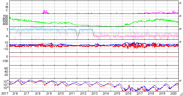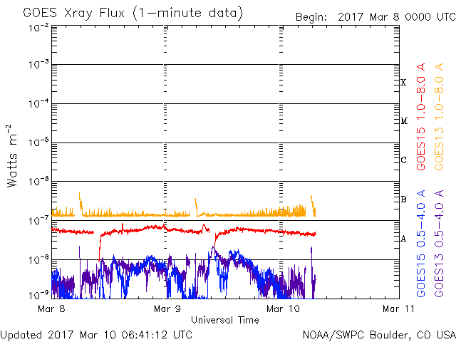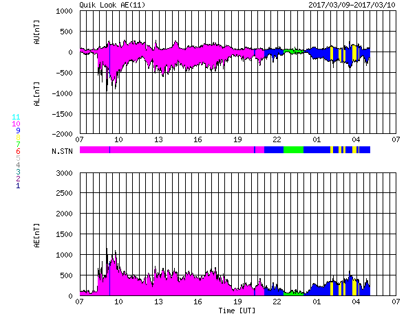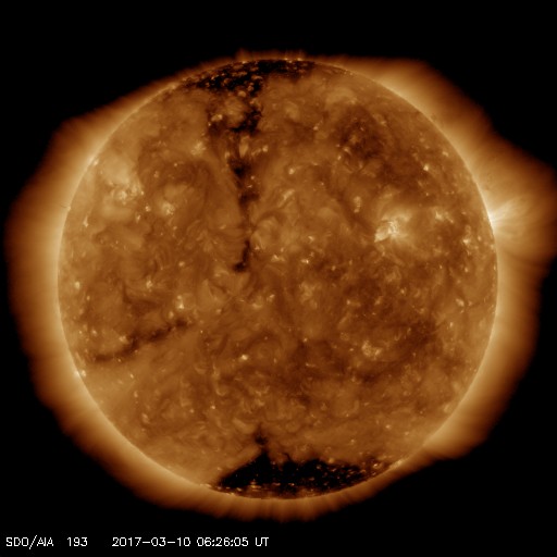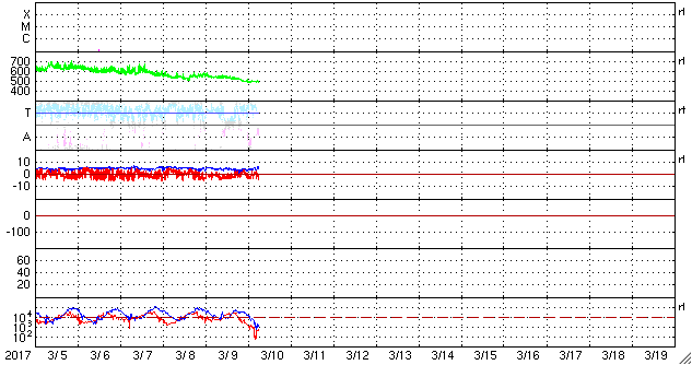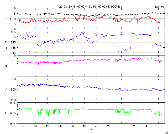 2017/ 3/10 15:41 更新 高速太陽風は500km/秒まで下がってきました。 担当 篠原 太陽風の速度は、昨夜から今朝にかけてもう一段下がり、 現在は500km/秒で安定しています。 少しずつ下がってきましたが、まだ高速風の状態です。 今回の高速風は3月1日に始まったので、 現時点で9日にわたって続いていることになります。 太陽風の磁場強度は、5nTで安定しています。 南北成分の振れ幅は小さくなってきましたが、 南向きの変化が目立っています。 このため、磁気圏は活動的な状態が続いていて、 AE指数は500nT前後の変化が続いています。 高速の太陽風は、終わりに近づいていると思われますが、 それとともに、磁気圏の活動も穏やかになっていくでしょう。 太陽は、今日も黒点は見えず、 X線グラフも目立った変化はありません。 SDO衛星AIA193の太陽写真でも、 明るく光る活動的な領域は特に見られず、太陽はとても穏やかです。 放射線帯の高エネルギー電子は、 今日も数万に達する高まりを記録していますが、 グラフの最新の値は下がりかけています。 こちらも、この後は次第に低下に向かうでしょう。 ![]() SDO衛星のAIA193カメラによる太陽コロナの様子 (c) SDO (NASA) ![]() SDO衛星による太陽の可視光写真 (c) SDO (NASA) ![]() DSCOVRが観測した太陽風の磁場(1番上の枠、黒線は全体の強度、赤線は南北成分) および、太陽風の密度(3番目の紫線)、速度(4番目の青線) (c) データ:NOAA/SWPC、作図:宇宙天気ニュース ![]() リアルタイムAE指数 下段のAEグラフの値が高くなると、オーロラ活動が活発化しています。 (c) 京都大学, NICT ![]() 27日の太陽周期に合わせたデータプロット 太陽が同じ面を地球に向けていた27日前の変化から、今後を予想することができます。 (c) 作図:宇宙天気ニュース