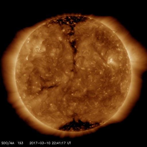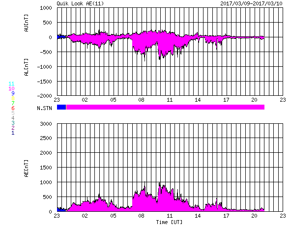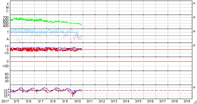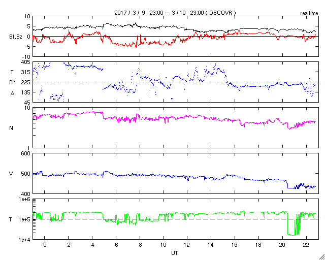 2017/ 3/11 07:58 更新 太陽風は平均的な速度に戻っています。太陽は無黒点が続いています。 担当 篠原 太陽風の速度は更に下がり、 430km/秒と平均的な速さに戻っています。 地球は高速太陽風の領域を通り抜けました。 磁場強度は、5nTから3nTヘ下がり、 やや弱くなっています。 南北成分は、グラフの前半は南寄り、 後半は0nT付近です。 この南寄りの時間帯に対応して、 AE指数のグラフは、 500〜1000nTの中規模の変化が発生しています。 高速太陽風が終わって、 今後は、磁気圏の活動も次第に弱くなっていくでしょう。 27日周期の図を見ると、前周期は2月15日まで低速の太陽風が続き、 16日から再び速度が高まっています。 今回も、これからしばらくは穏やかな太陽風が続きそうです。 その後、速度の高まりがやって来るかどうかですが、 SDO衛星AIA193の太陽写真では、 高速風をもたらすコロナホールが小さくなっている様です。 太陽風への影響も弱くなっている可能性があります。 太陽は、今日も黒点はなく、 とても穏やかです。 放射線帯の高エネルギー電子は、減少し始めていて、 GOES13(赤線)は、10,000を割りそうです。 ![]() SDO衛星のAIA193カメラによる太陽コロナの様子 (c) SDO (NASA) ![]() SDO衛星による太陽の可視光写真 (c) SDO (NASA) ![]() DSCOVRが観測した太陽風の磁場(1番上の枠、黒線は全体の強度、赤線は南北成分) および、太陽風の密度(3番目の紫線)、速度(4番目の青線) (c) データ:NOAA/SWPC、作図:宇宙天気ニュース ![]() リアルタイムAE指数 下段のAEグラフの値が高くなると、オーロラ活動が活発化しています。 (c) 京都大学, NICT ![]() 27日の太陽周期に合わせたデータプロット 太陽が同じ面を地球に向けていた27日前の変化から、今後を予想することができます。 (c) 作図:宇宙天気ニュース