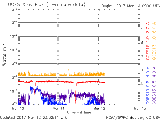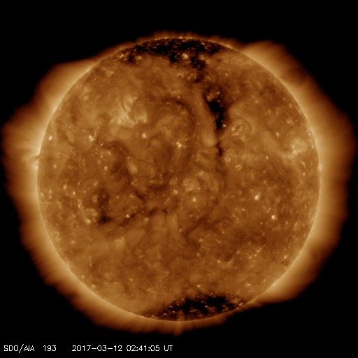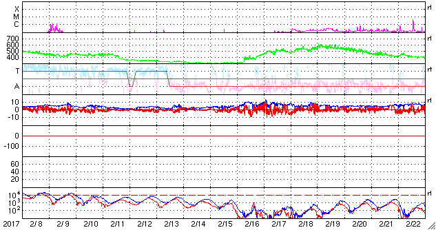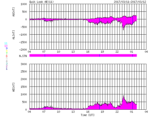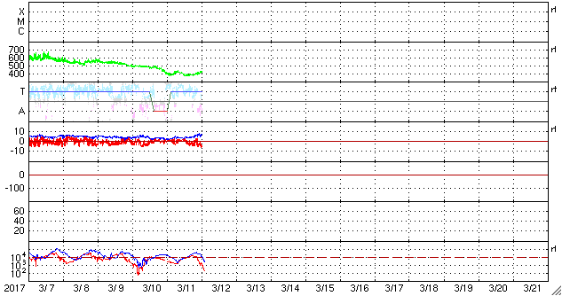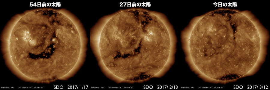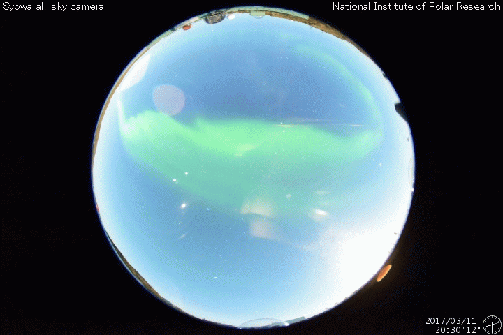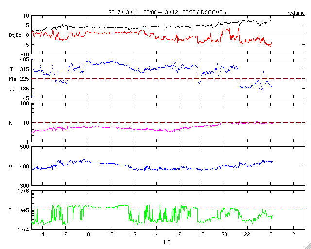 2017/ 3/12 12:00 更新 太陽風は平均的な状態です。磁気圏はやや活動的です。 担当 篠原 太陽風は、400km/秒と平均的な速さで安定しています。 磁場強度は、3nTに少し弱まっていましたが、 今朝くらいから、5nTと平均的な値に戻っています。 セクターの境界を越えつつある様で、 27日周期の図を見ると、「T」から「A」に変わろうとしています。 太陽風磁場の南北成分は、 太陽風のグラフの後半から南寄りの傾向が強まり、 -3nTから-5nT程度の南向き磁場が続いています。 これに伴って磁気圏の活動もやや高まっていて、 AE指数のグラフは、後半から500nT前後の変化が続いています。 世界時11日20時半頃のオーロラの様子を、 南極、昭和基地の全天カメラの動画で紹介します。 満月に近い明るい夜空ですが、オーロラの光が空全体を飾っています。 27日周期の図の前周期のグラフでは、 2月17日から次の高速太陽風が始まっています。 周期性で考えると、3月16日頃に回帰が予想されますが、 SDO衛星AIA193の写真を見ると、 コロナホール広がりが以前の周期からだいぶ変わっています。 今日の2枚目の図は、 過去(左・中)と現在(右)の太陽コロナの様子です。 左端の写真では、太陽の中央部に弓状に コロナホールが大きく広がっていましたが、 中央の写真では広がりが小さくなり、 右の現在の写真では、ほとんど見えなくなっています。 この変化に伴って、今後の太陽風の様子が変化する可能性があります。 3月16日以降の高速風の回帰がどの程度になるのか、 今週の後半に注目してください。 太陽は、今日も無黒点です。 NOAA/SWPCの報告では、3月7日以降、6日連続で無黒点です。 放射線帯の高エネルギー電子は、 GOES13、15ともに10,000を超えています。 太陽風が穏やかになり、ゆっくりと減少していくでしょう。