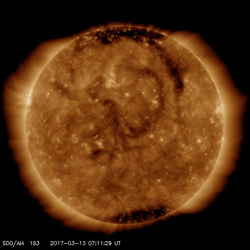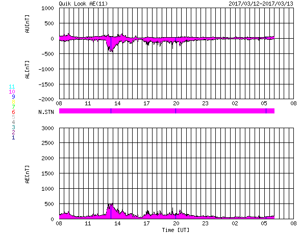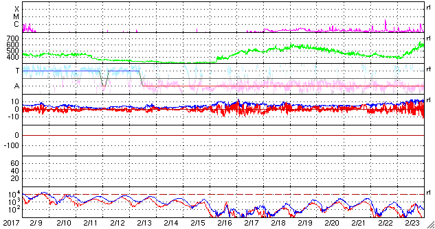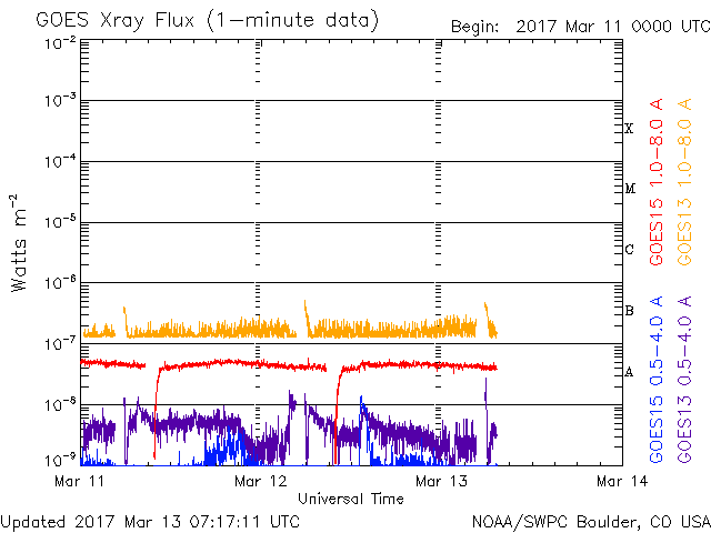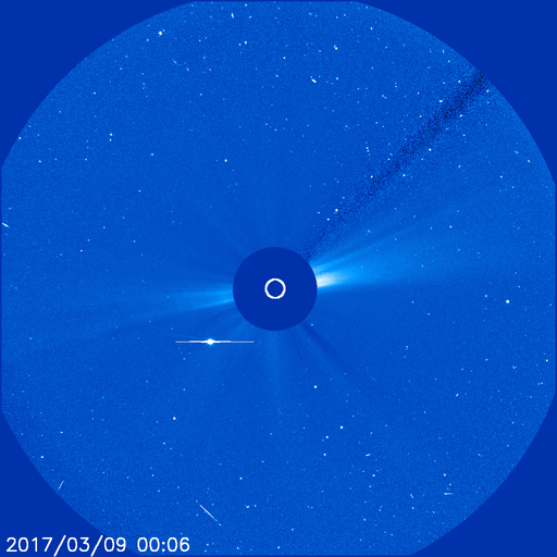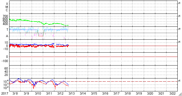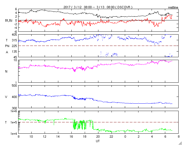 2017/ 3/13 16:17 更新 太陽風は340km/秒の低速風になっています。無黒点は続いています。 担当 篠原 しばらく前からSOHO衛星LASCO C3の画面を、 水星が右から左に横切っていました。 その様子に注目していたのですが、 今日、小さい彗星が太陽の手前を横切って行くのに気付きました。 3月9日から今日までのSOHO衛星LASCO C2、C3の動画を掲載します。 左端から小さい光点が右へぐんぐん進んで行き、 太陽の近くでは左に向かって小さい尾も伸ばしています。 宇宙天気の現象ではありませんが、どうぞご覧下さい。 太陽風の速度は、昨日いっぱいで400km/秒を割り、 現在は340km/秒の低速風になっています。 27日周期の図の前周期も300km/秒近くまで下がっていたのですが、 今回も同様の推移になっています。 太陽風の磁場強度は、3nT前後と弱くなっています。 南北成分は南寄りになっているのですが、 振れ幅は小さく、速度も下がっているため、 磁気圏の活動は弱くなっていて、 AE指数は、500nTの変化も1回起きていますが、 その他は200nT程度の小さい変化が続いています。 SDO衛星AIA193の太陽写真は、 昨日紹介した様に中央部のコロナホールは消えてしまい、 全体がぼんやりと光っています。 この領域からやって来る太陽風がどのような変化になるのか、 今週の後半にかけて注目してください。 太陽は、今日も黒点はなく、とても穏やかです。 放射線帯の高エネルギー電子は、 GOES13(赤線)は1万を割り、 GOES15(青線)も1万にやっと届いた程度です。 引き続き低下していくでしょう。