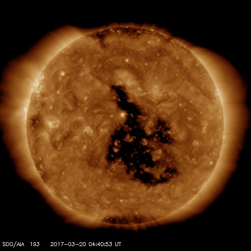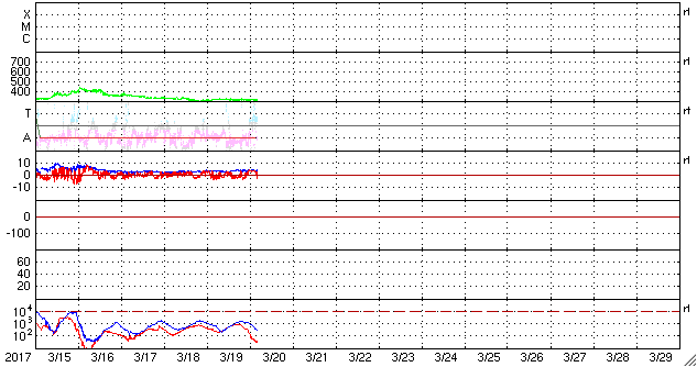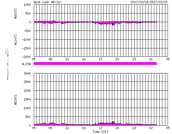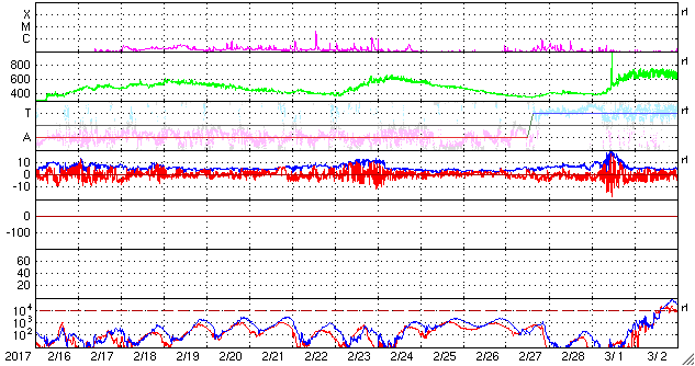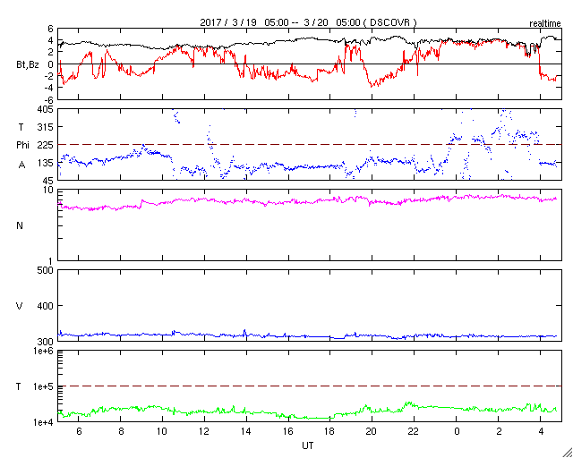 2017/ 3/20 13:58 更新 低速の太陽風が続き、磁気圏も静穏です。フィンランドのオーロラをどうぞ。 担当 篠原 谷口直樹さんより、 2月15日、18日にフィンランド・ロヴァニエミで撮影された オーロラの写真をいただきました。 先週、回帰がなくて消えてしまった高速太陽風の 前周期の到来時に発生したオーロラです。 1枚目は高速風が始まる前のオーロラで、 この日はあまり強くなることもなく北の空遠くに出続けたそうです。 2、3枚目は高速風到来後の撮影です。 17日夜の早い時間は弱いオーロラでしたが、 日付が変わる頃に一気にブレークアップし、 2時間くらい強いオーロラが出現していたとのことです。 谷口さんは、1か月にわたってフィンランドでオーロラを観測されたそうです。 その間に、高速太陽風が3度にわたってやって来ています。 素晴らしいオーロラに何度も遭遇されたことでしょう。 美しい写真をありがとうございます。 現在の太陽風は、310km/秒と低速の状態が続いています。 磁場強度も、3nTとやや弱まったまま安定してます。 磁気圏も静穏で、AE指数は小さい変化が見られる程度です。 一方、SDO衛星AIA193では、コロナホールが太陽の中心に広がり、 地球の方向に速度の高い太陽風を吹き出しているところです。 この高速風の始まりは、明日か明後日頃と思われます。 今後の太陽風の変化に注目して下さい。 太陽は今日も無黒点で、 X線のグラフに変化はありません。 ![]() フィンランド・ロヴァニエミで、現地2月15日22〜23時頃に撮影されたオーロラ。 (c) 谷口直樹氏 ![]() フィンランド・ロヴァニエミで、現地2月18日0〜3時頃に撮影されたオーロラ。 (c) 谷口直樹氏 ![]() フィンランド・ロヴァニエミで、現地2月18日0〜3時頃に撮影されたオーロラ。 (c) 谷口直樹氏 ![]() SDO衛星のAIA193カメラによる太陽コロナの様子 (c) SDO (NASA) ![]() SDO衛星による太陽の可視光写真 (c) SDO (NASA) ![]() DSCOVRが観測した太陽風の磁場(1番上の枠、黒線は全体の強度、赤線は南北成分) および、太陽風の密度(3番目の紫線)、速度(4番目の青線) (c) データ:NOAA/SWPC、作図:宇宙天気ニュース ![]() リアルタイムAE指数 下段のAEグラフの値が高くなると、オーロラ活動が活発化しています。 (c) 京都大学, NICT ![]() 27日の太陽周期に合わせたデータプロット 太陽が同じ面を地球に向けていた27日前の変化から、今後を予想することができます。 (c) 作図:宇宙天気ニュース