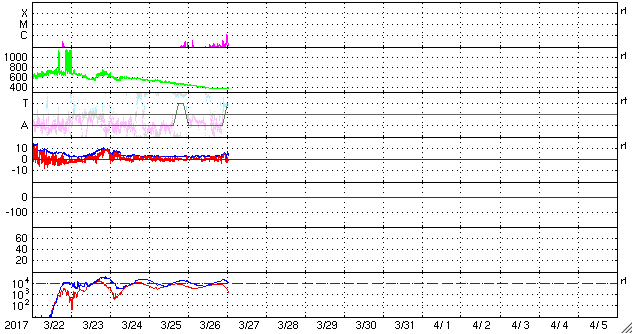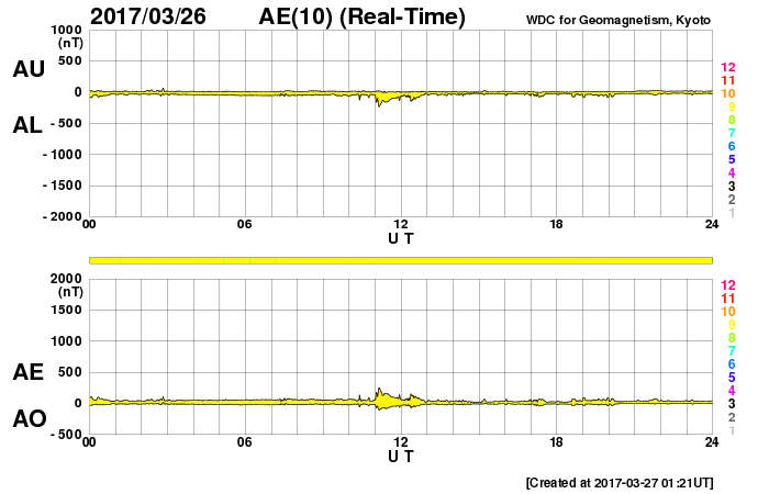 (c) SDO (NASA)、(動画加工 : 宇宙天気ニュース) ![]() 2644黒点群の活動の様子。SDO衛星AIA131。 (c) SDO (NASA)、(動画加工 : 宇宙天気ニュース) ![]() 世界時3月26日のAE指数速報値。 (c) 京都大学WDC ![]() SDO衛星のAIA193カメラによる太陽コロナの様子 (c) SDO (NASA) ![]() SDO衛星による太陽の可視光写真。マウスの矢印を写真に重ねると、黒点番号付きの写真に切り替わります。 (c) SDO (NASA) ![]() GOES衛星の太陽X線データ (c) NOAA/SWPC ![]() DSCOVRが観測した太陽風の磁場(1番上の枠、黒線は全体の強度、赤線は南北成分) および、太陽風の密度(3番目の紫線)、速度(4番目の青線) (c) データ:NOAA/SWPC、作図:宇宙天気ニュース ![]() 27日の太陽周期に合わせたデータプロット 太陽が同じ面を地球に向けていた27日前の変化から、今後を予想することができます。 (c) 作図:宇宙天気ニュース