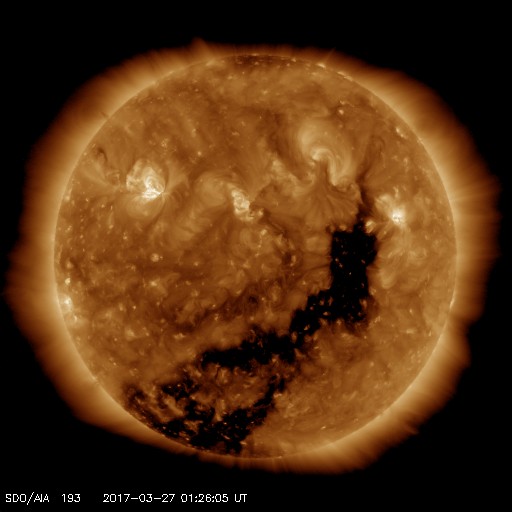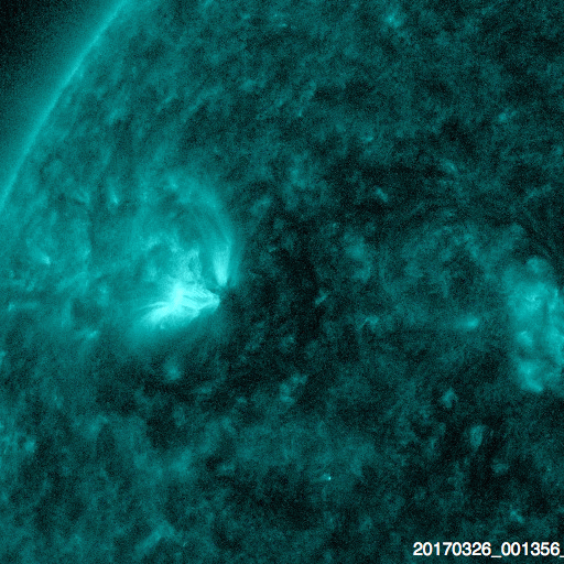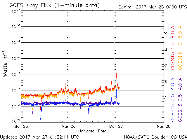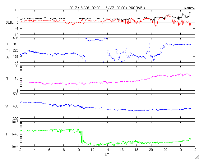 2017/ 3/27 10:31 更新 2644黒点群が発達し、C1の小規模フレアを起こしました。 担当 篠原 昨日、太陽の東側(左側)に現れた新しい黒点は、 2644黒点群と番号が付けられ、その後大きく発達しています。 その様子を、SDO衛星の可視光写真による動画で紹介します。 26日6時〜27日9時(世界時25日21時〜27日0時)の変化です。 X線の強度も次第に上昇して、小刻みな変化も増え、 27日9時(世界時27日0時)には、C1.3の小規模フレアが発生しました。 Cクラスに達するフレアの発生は、2月24日のC1.1以来、31日ぶりです。 SDO衛星AIA131による2644黒点群のフレアの動画を掲載します。 フレアの規模は小さいので、目立つほどの変化ではありません。 2644黒点群の今後の推移に注目して下さい。 太陽風は、昨夜にかけて速度は更に低下して、 370km/秒とやや低速の風になりました。 今朝の段階では、そのまま下がった状態が続いていますが、 磁場強度が、3nTから5nTに少し上がり、 太陽風の密度も高まる様子を見せています。 次の高速風の始まりが近づいているのかもしれません。 引き続き、太陽風の変化に注目して下さい。 太陽風磁場の南北成分は、0nTから弱い北寄りで推移しています。 このため磁気圏は静穏で、AE指数は小さい変化が起きている程度です。 今後、太陽風が強まって、磁場が南向きに変化するようになると、 磁気圏の活動も高まる可能性があります。 ライブカメラなどにも注目してください。 放射線帯の高エネルギー電子は、昨日と同程度で、 GOES15(青線)は10,000を超えた状態です。